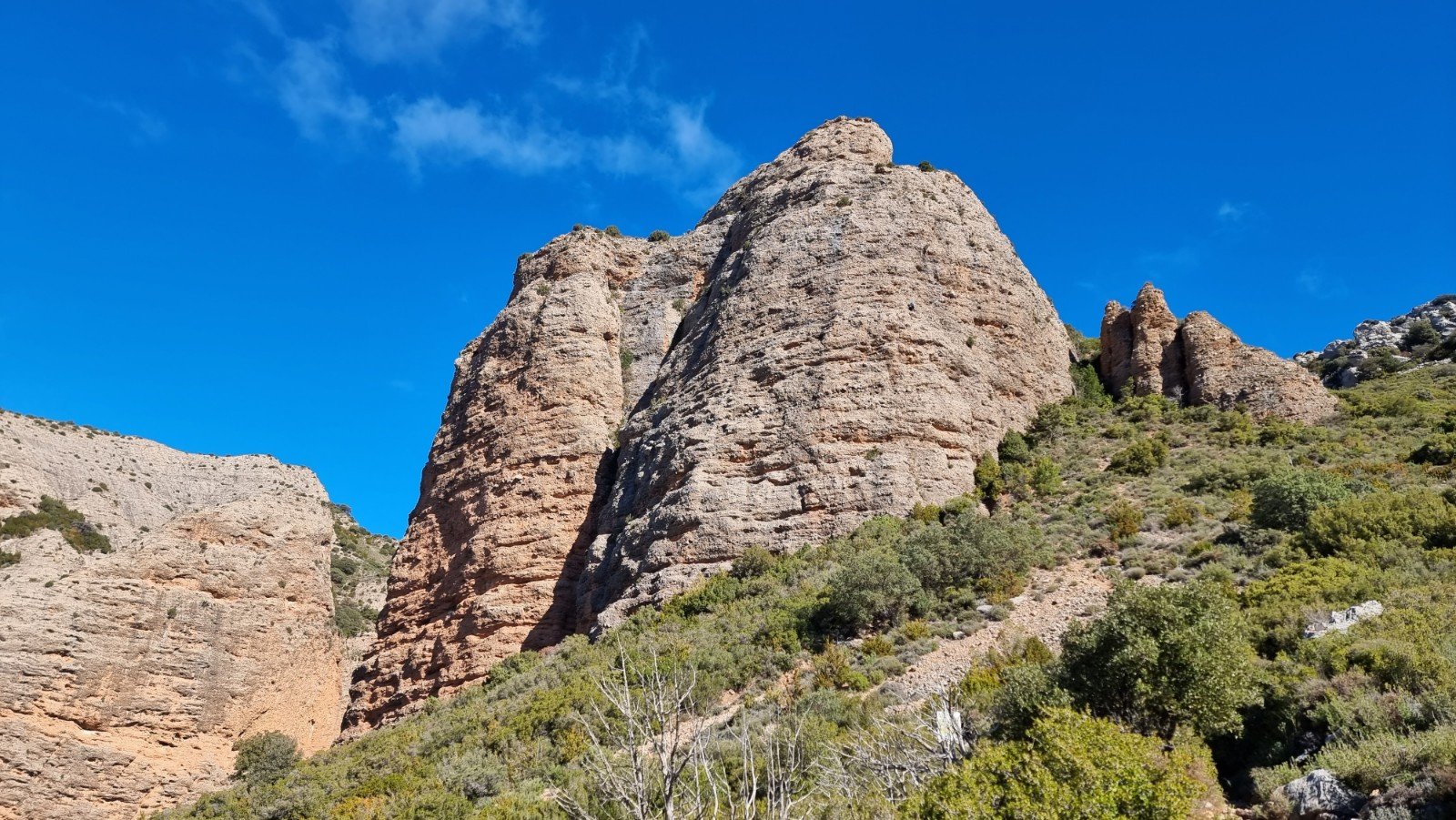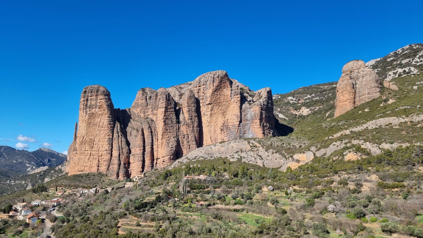 Nearing the end of our traverse of the Pyrenees, a fine day’s forecast coincided with us passing Riglos, and the opportunity to drop in was too good to ignore. The view of the iconic Mallos formations from the designated van parking spot at the Vulture viewing area – Centro de Interpretación de Aves ARCAZ – merited a beer (and crossed fingers that the weather really would clear).
