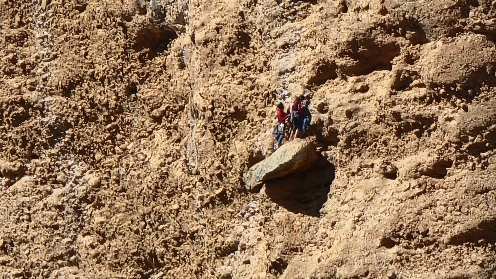 … and the braille trail of chalk up Fiesta de los Biceps on the left (passing just left of the two “eyes” which are actually streaks of vulture guano).