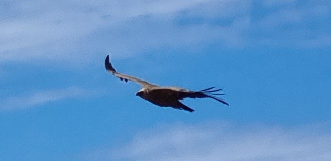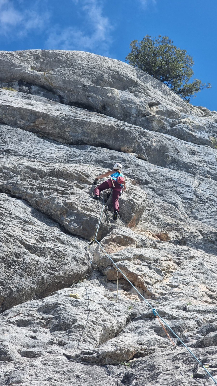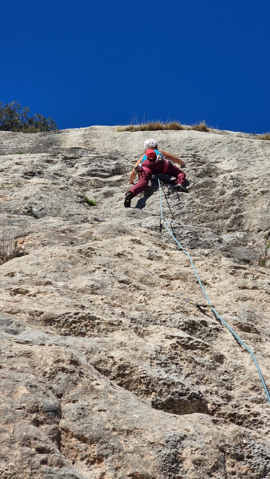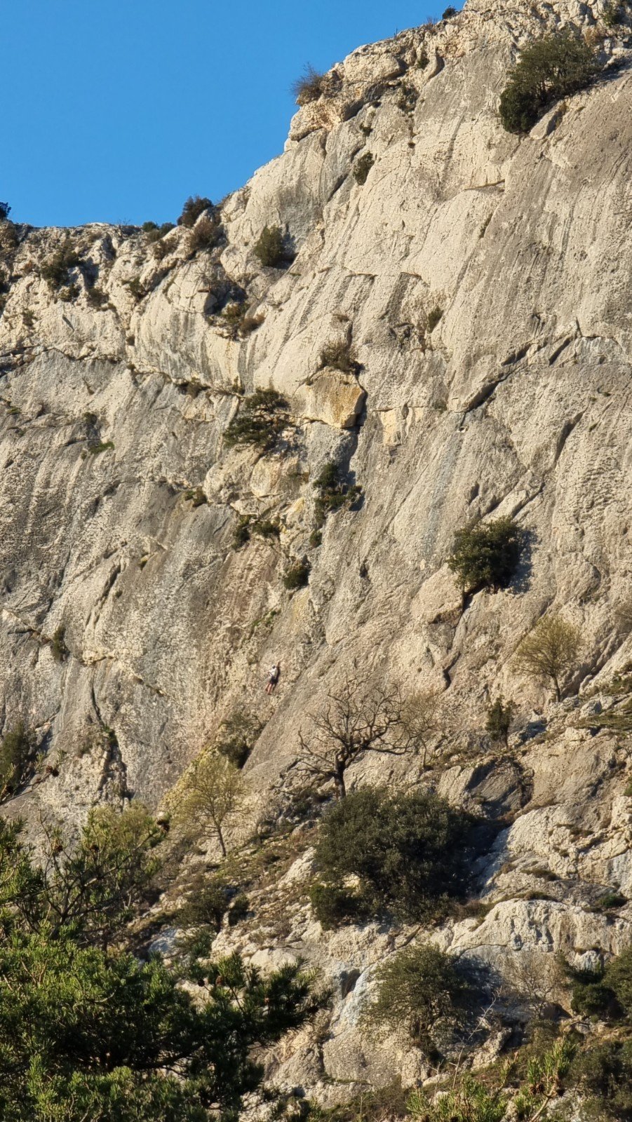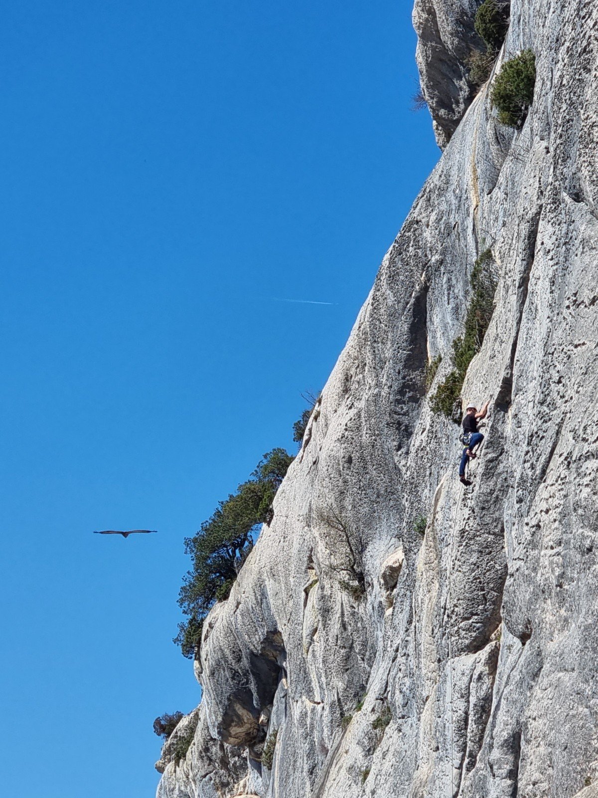 … but later discovered that “alpiste” actually means “birdseed”, so their appetite for climbers remains an open question! In any event, this chap (on one of the 30+m 6cs towards the centre of the crag) seemed to survive his close encounter: