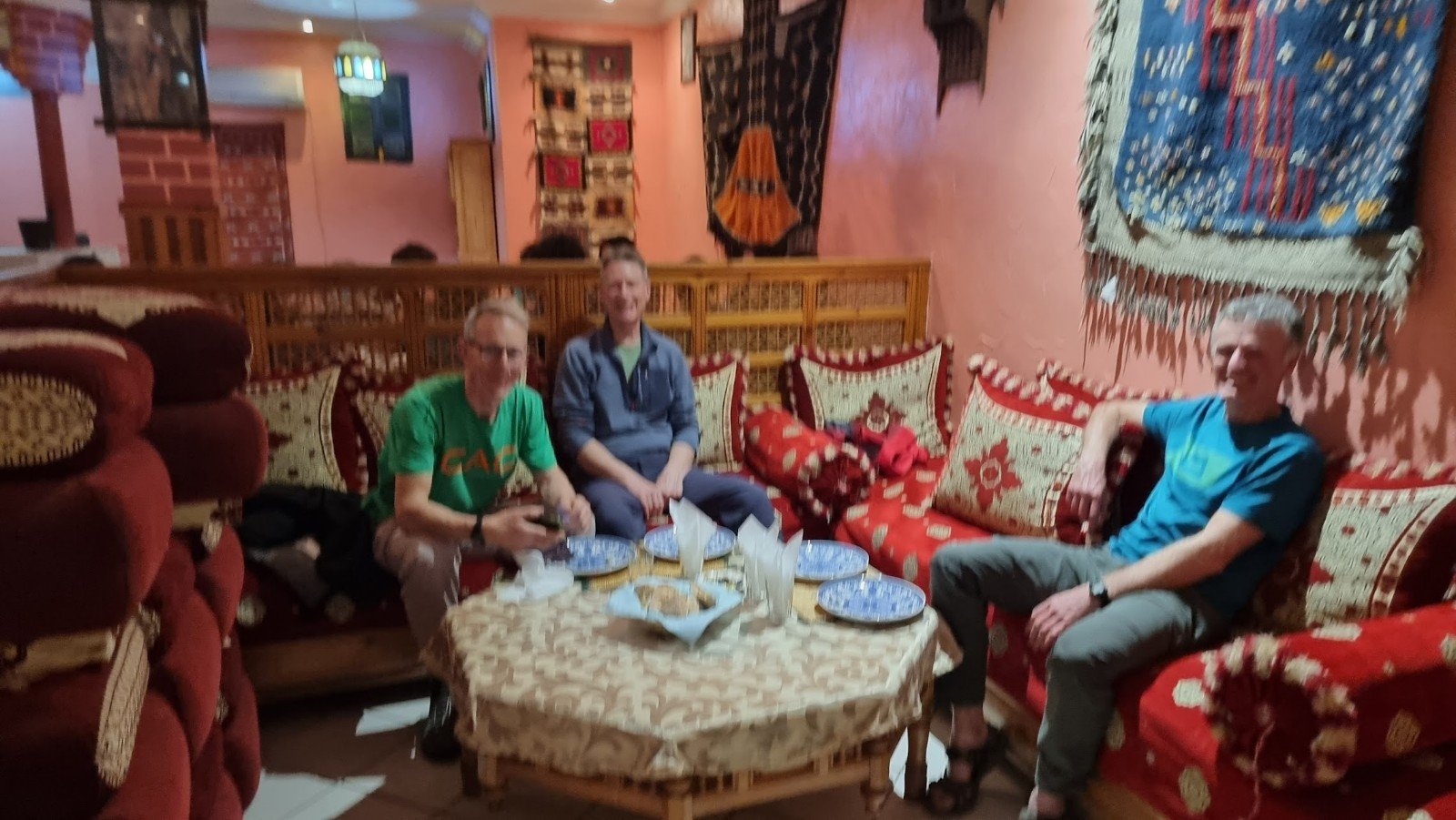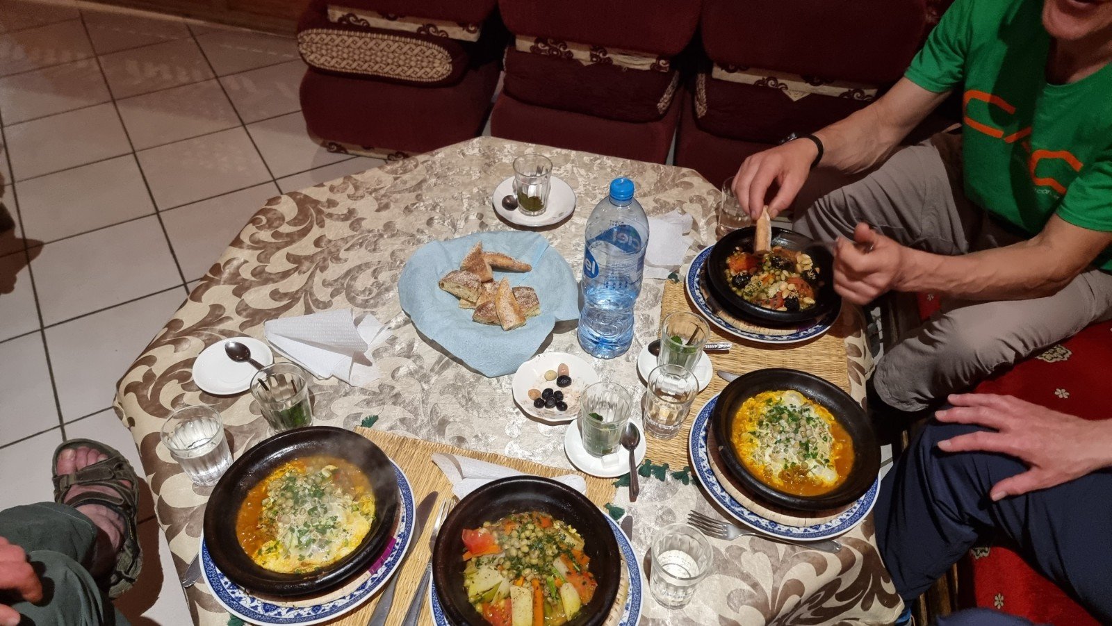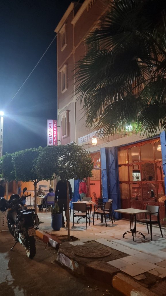 There are plenty of eating options in Tafraout, the biggest settlement for 100km (though that isn’t saying much!) but the Kasbah restaurant (not to be confused with the Kasbah Tizourgane – see the next post) came highly recommended and we’d thoroughly endorse that – we ended up eating there all three nights sampling different dishes from the 90 Dirham (about £7) 3-course menu, washed down with mint tea, and enjoying the great Berber hospitality of Mohamed and his staff.