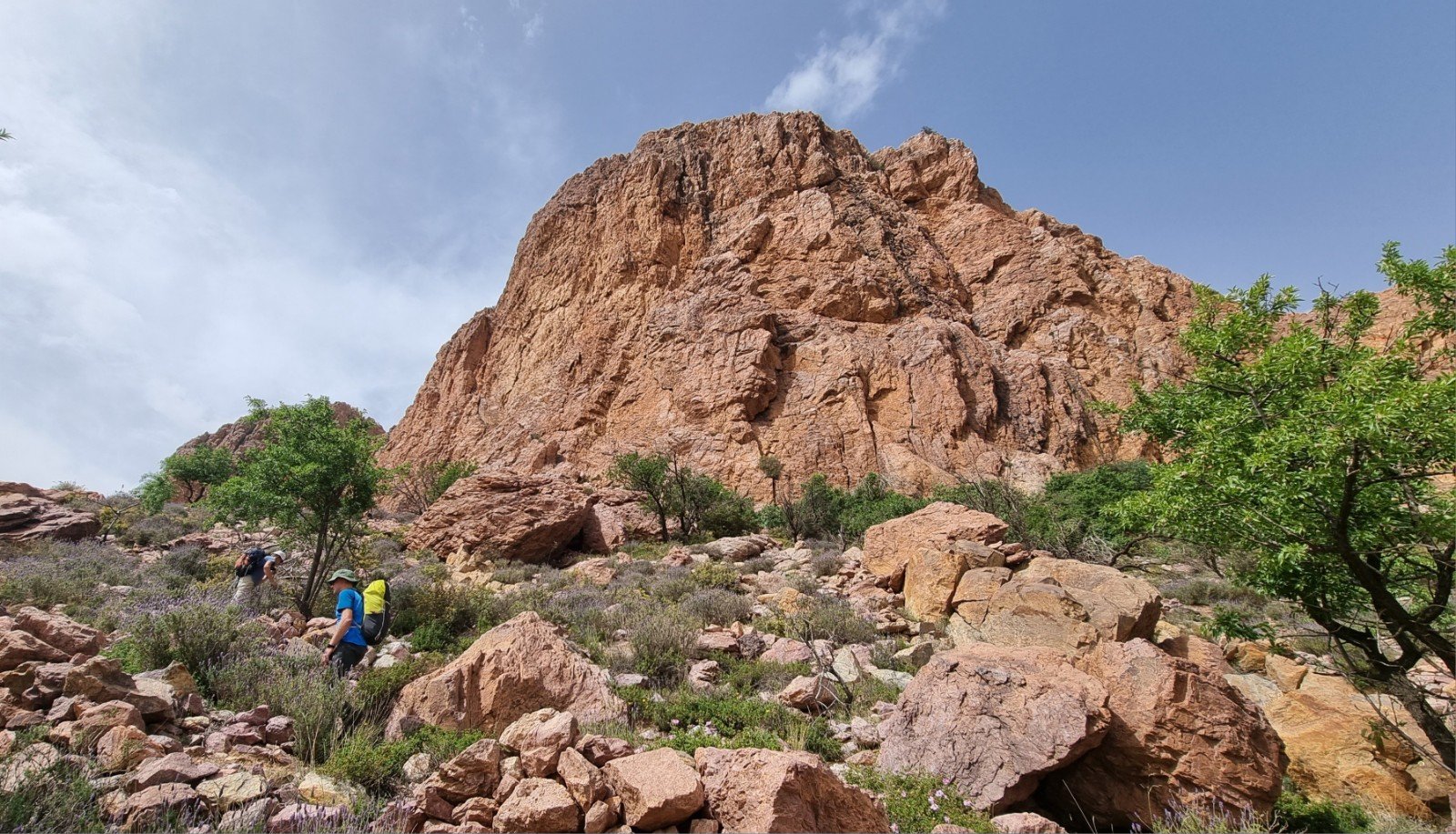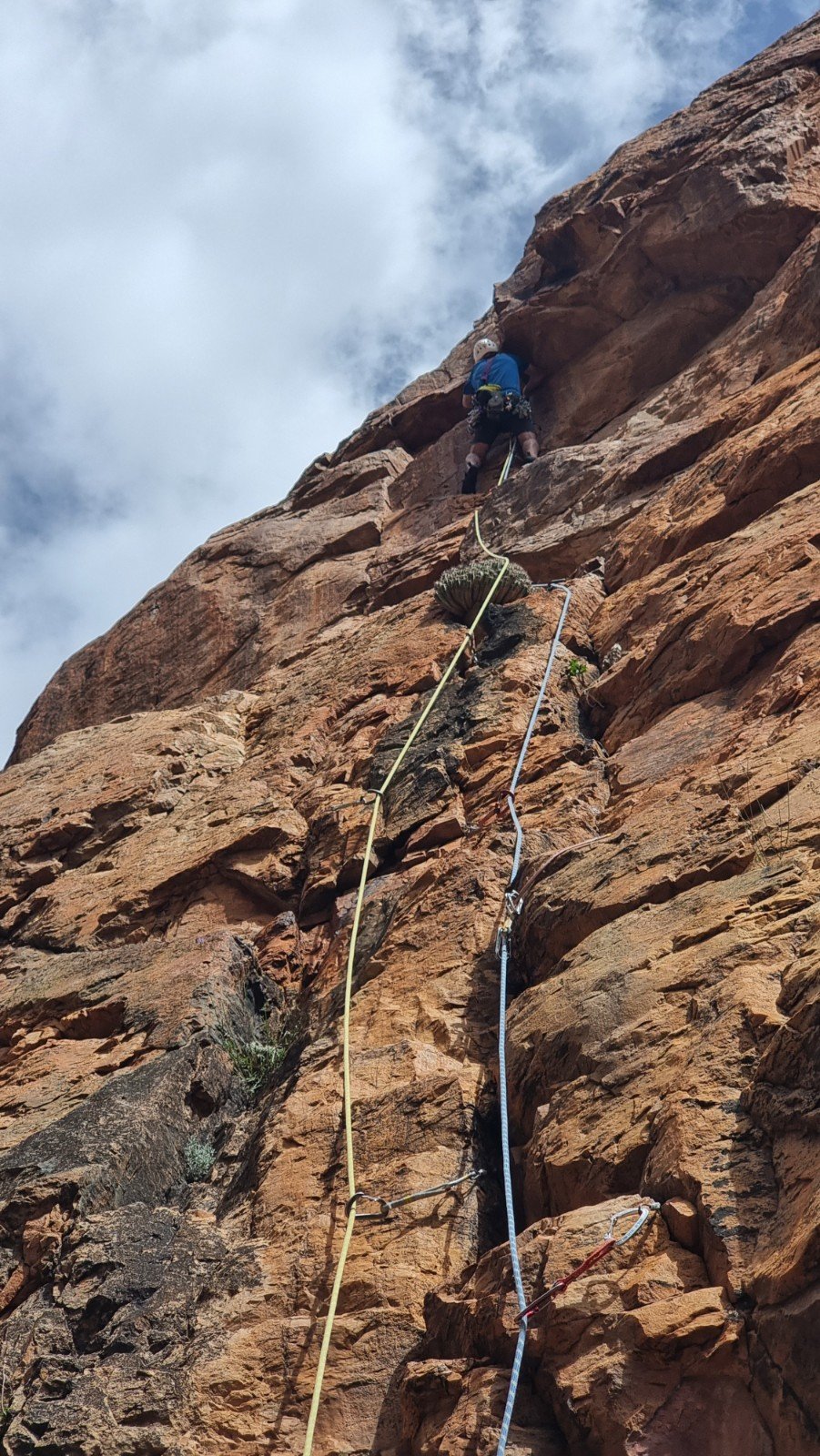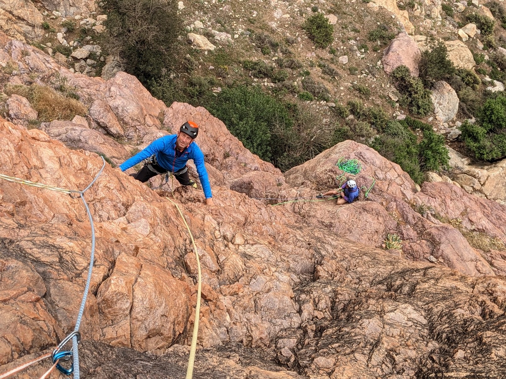 Graham recommend Eros to Paul and me, a 4-pitch E2 5b, while he and Andy did the adjacent Aphrodite at the same grade. With an overall length of 215m you can do the maths to work out they’re all rope-stretching pitches. It’s about an hour’s approach, through prickly, rocky terrain, studded with spectacular desert flowers.
