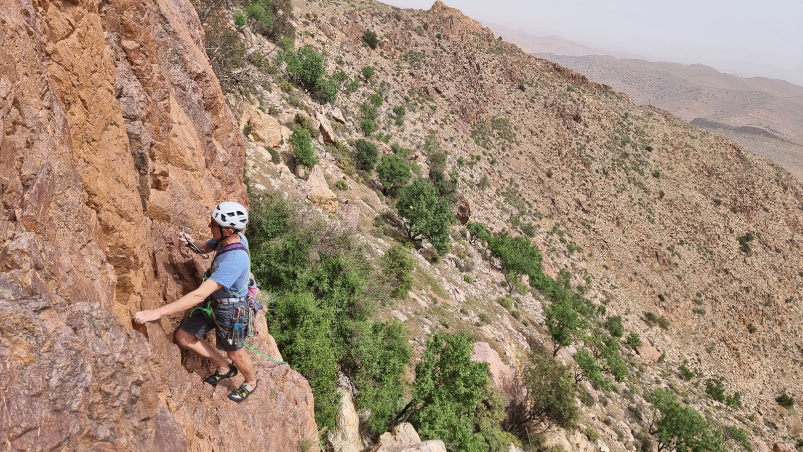 For the return visit I teamed up with Paul, Andy and Graham, with a two-centre schedule starting in Tafraout for 3 days then spending the remaining 4 nights at Kasbah Tizourgane on the north side of the range. Mid-April is probably as late as you’d want to plan a trip, with temperatures in the high 20s, clear blue skies and a blazing sun, so shady crags are essential. Unsurprisingly, these are at a premium around Tafraout (on the south side of Jebel Kest) and we actually ended up driving halfway back to the Kasbah to the East-facing Greek Buttress near Sidi M’Zal for our first route.
