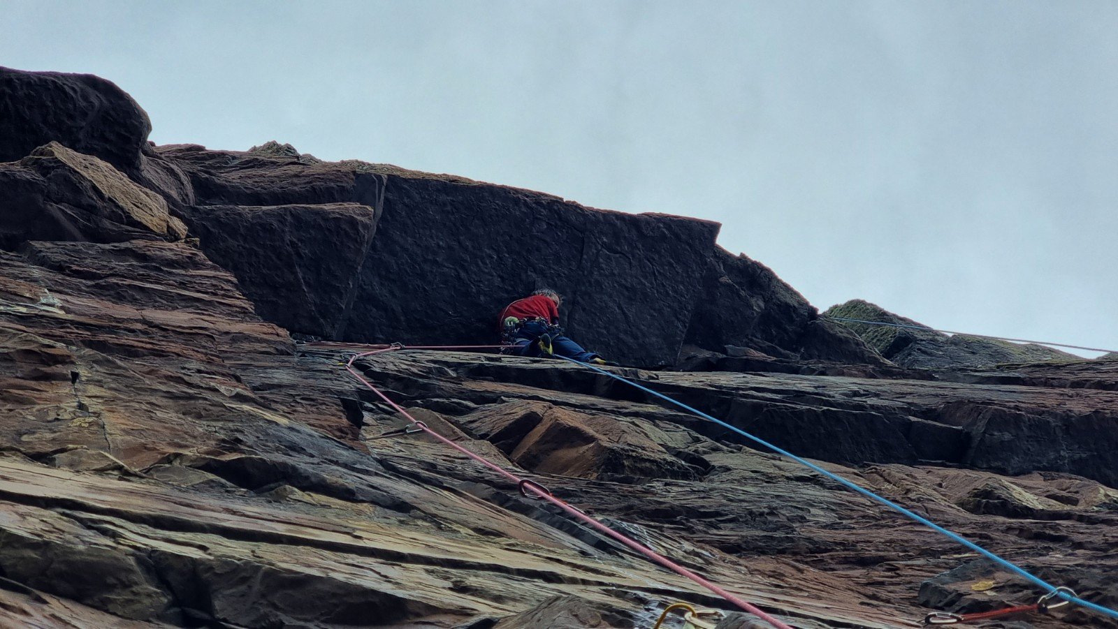 The sun was making a concerted effort to see the day out on a high, and it would have been a shame not to make the most of it, so Donie and I teamed up for Brains as well as Braun, E4 6a. Another stunning line, this time on the left side of the crag, with contrasting burly moves around the mid-height roof followed by a sting-in-the-tail final headwall. Donie had plenty of both requisites and I was pretty happy to sketch my way up on the bottom end of the rope. Views back towards Martin and Neil on Non Stop Nitty Gritty…