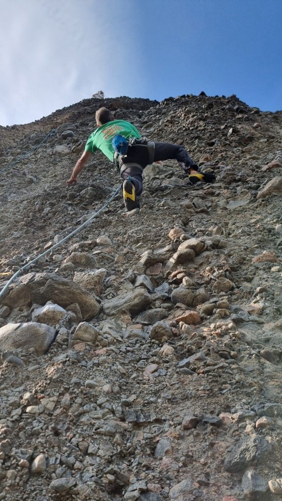 In hindsight, it might have been better (as well as highly appropriate) if I’d tagged on to that rope, rather than sign up for an E3 with a huge traverse, but the die was cast. Here’s Stan setting off…