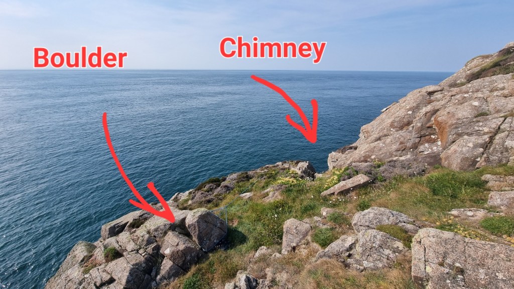 Tearing ourselves away from the obvious attractions of Whitesands Bay we managed the approach to the crag-top in around the guidebook time of 30 mins, but then spent another half hour of head-scratching to identify the rap point. Here are the GPS coordinates to save you the bother: 51.910331° N 05.298254° W and a view of the descent chimney and a handy boulder (60m rope was sufficient).