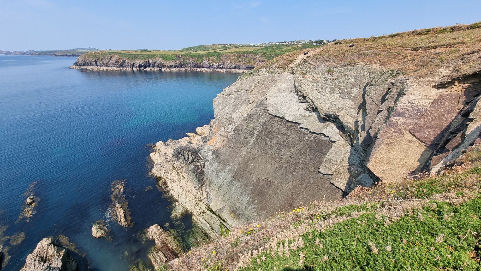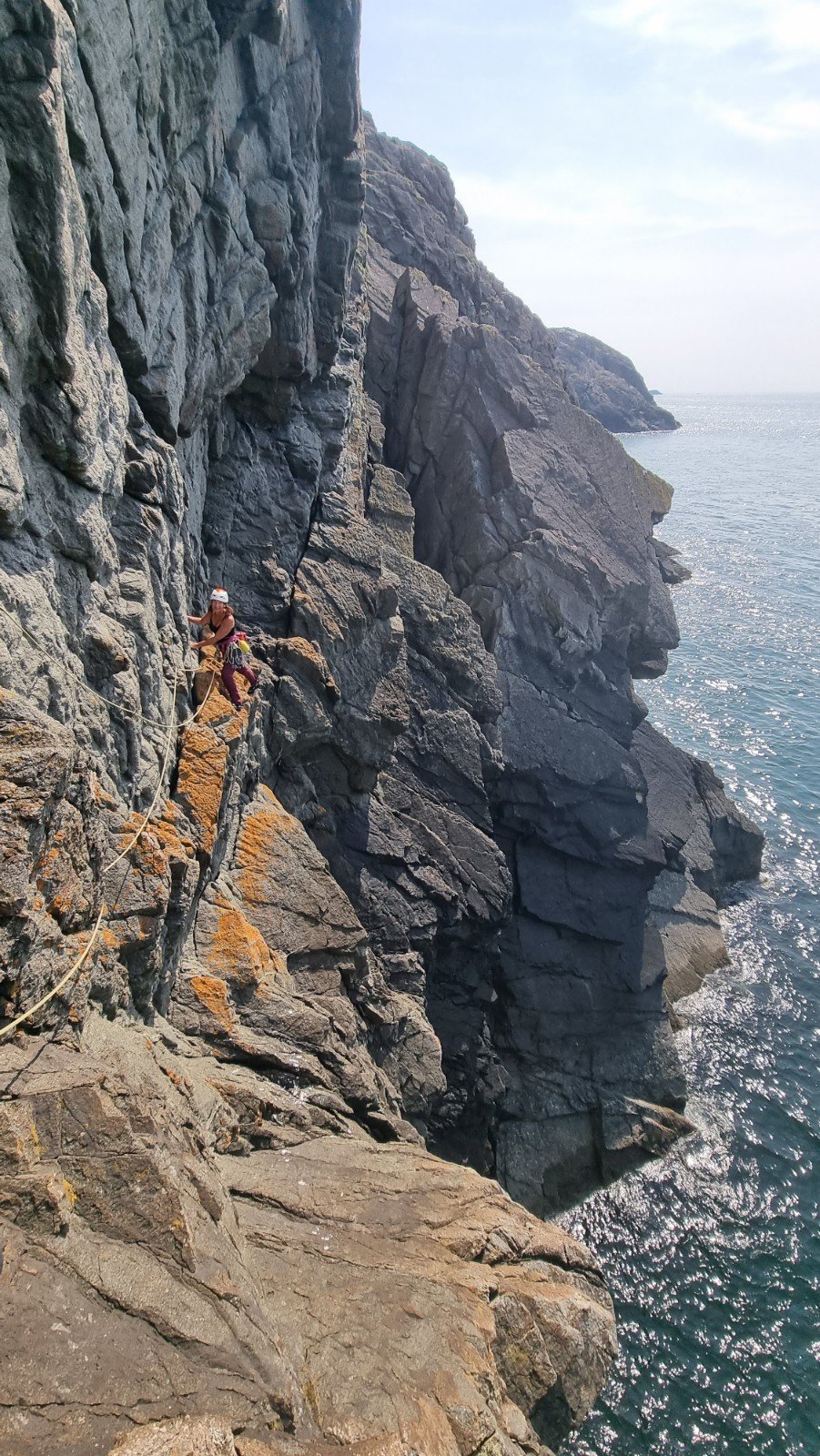 Sunny again the next morning, which really called for a north-facing crag, and Helen’s research unearthed Missing Link, a 9-pitch 175m VS traverse of St David’s Head.