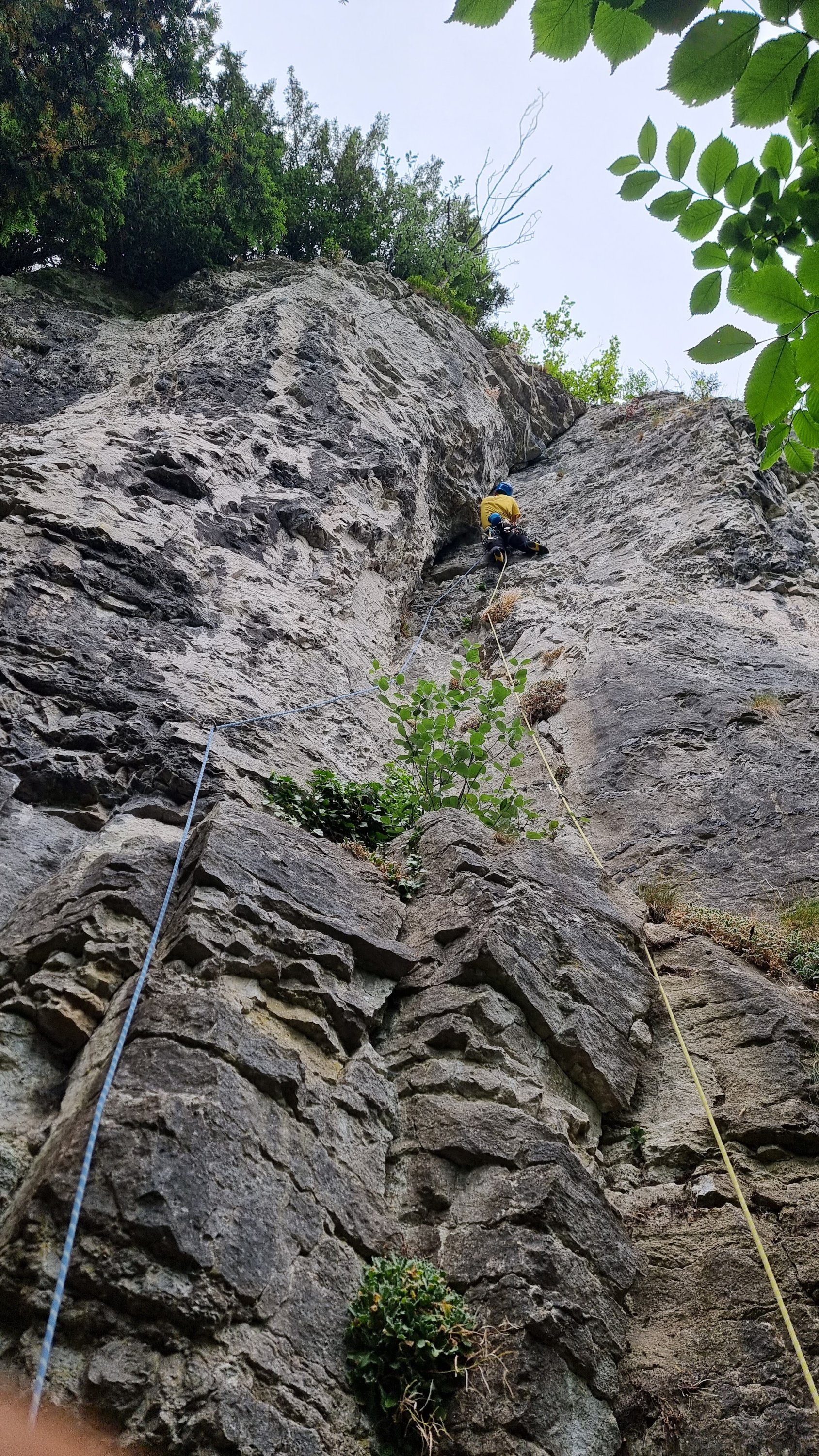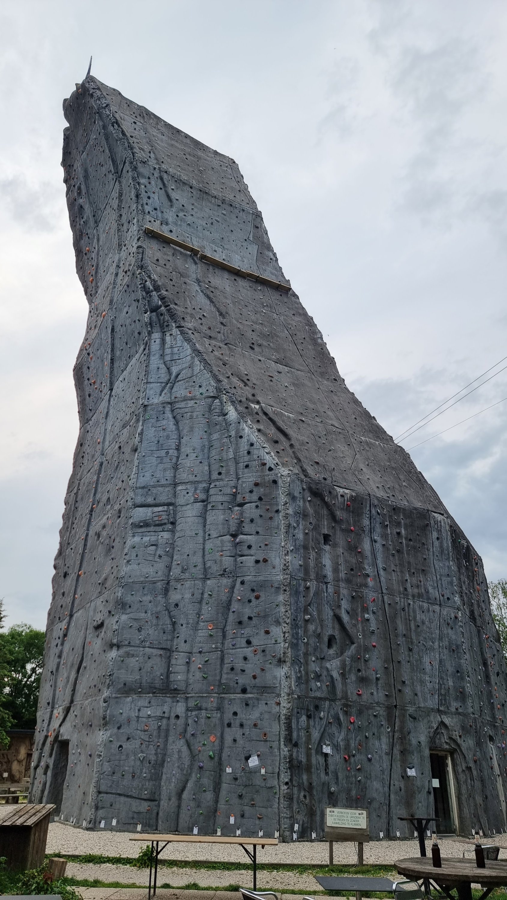 At 35m tall, it’s a pretty impressive structure, and plenty of imagination has been used to create featured “rock” with cracks, arêtes and a textured climbing surface. We clocked up around 500 ft of climbing before the forecasted rain stopped play (the start of the bigger storm in living memory in the area!), with a 3-pitch 6b+ (done in a oner) being a particularly memorable and testing journey.