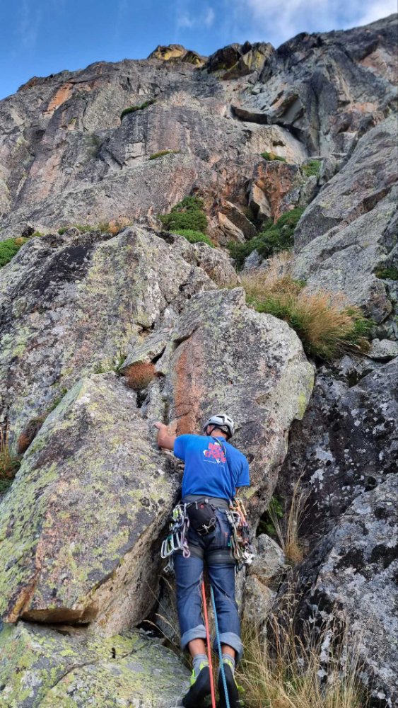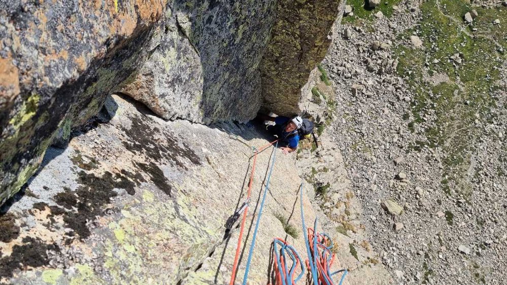 Happily Bill didn’t “Sausage”, and we mosied on upwards via a couple of easier pitches to the traverse beneath the giant orange wall that is easily visible from the refuge. Pitch 5 takes the steep corner on the right of this and is equally laughable at 6c, and not even trivial to aid.
