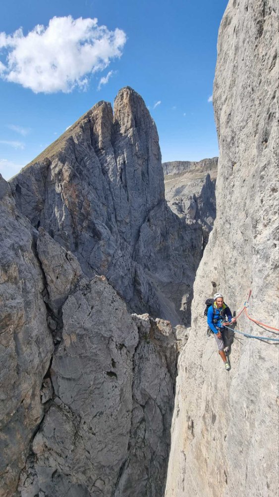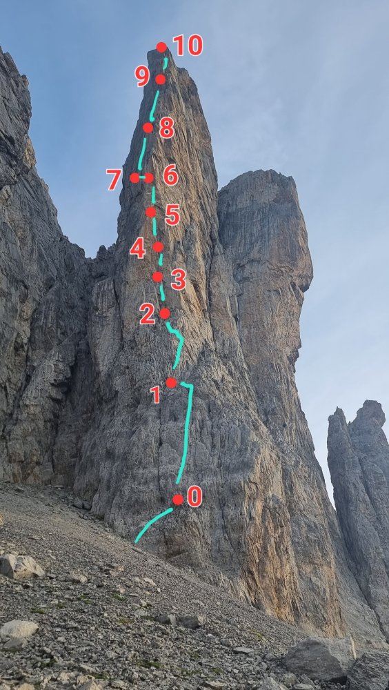 Petite aiguille d’Ansabère, South Spigolo, ED inf, 310 m, 10 pitches, 7b, 6a obligatory (concensus would suggest more like 6b/+ obligatory!)
