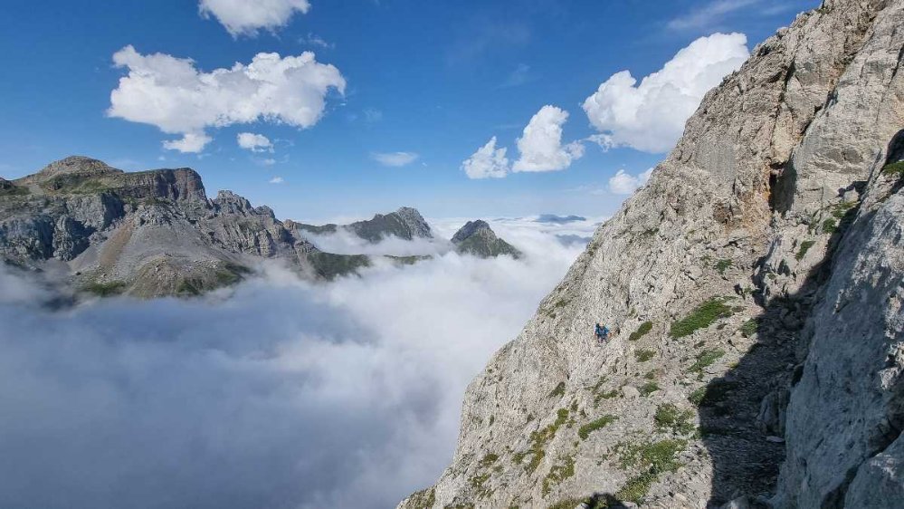 The subsequent 6b pitch is no pushover either, and meanwhile the exposure mounts as you climb the gently overhanging territory of the arete itself, with the Cabane d’Ansabère getting ever more distant below.
