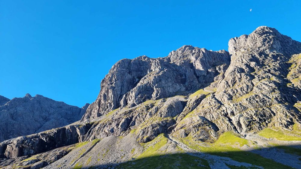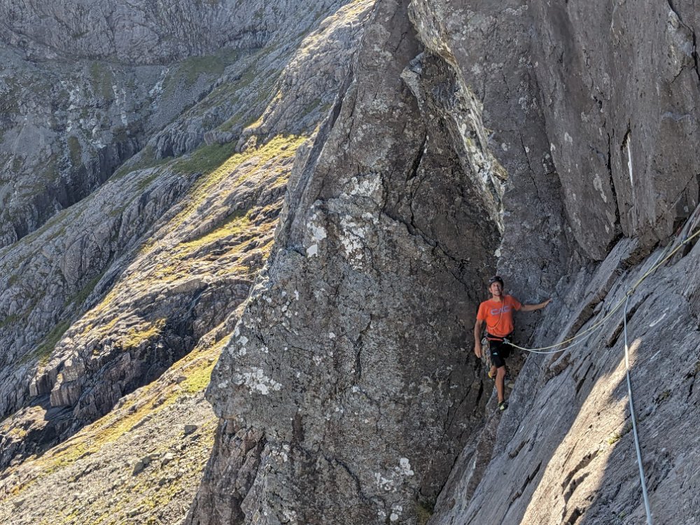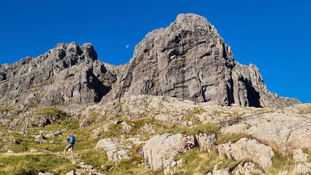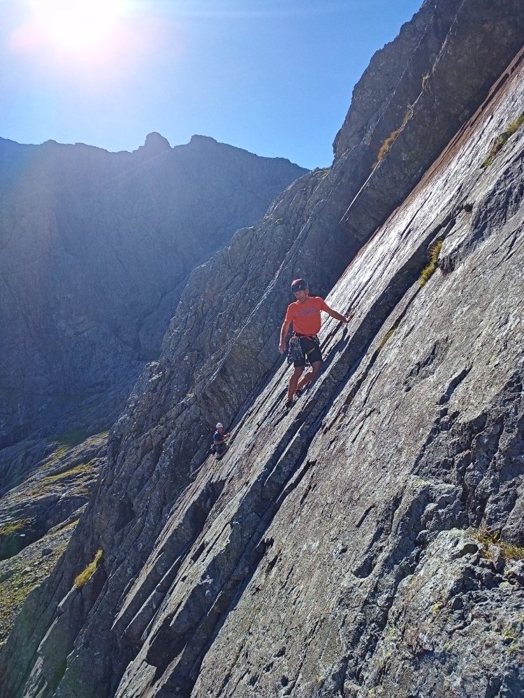As we arrived at the foot of the Carn Dearg we had the place to ourselves. A few wet streaks, and memories of the damp upper pitches on Swastika the day before (not to mention the pi$$-wet-through crux pitch on The Bat the year before) had us making the pragmatic choice of The Bullroar. This takes a huge left to right traverse of the whole face, and a quiet September Tuesday would be ideal timing as we wouldn’t be criss-crossing others.