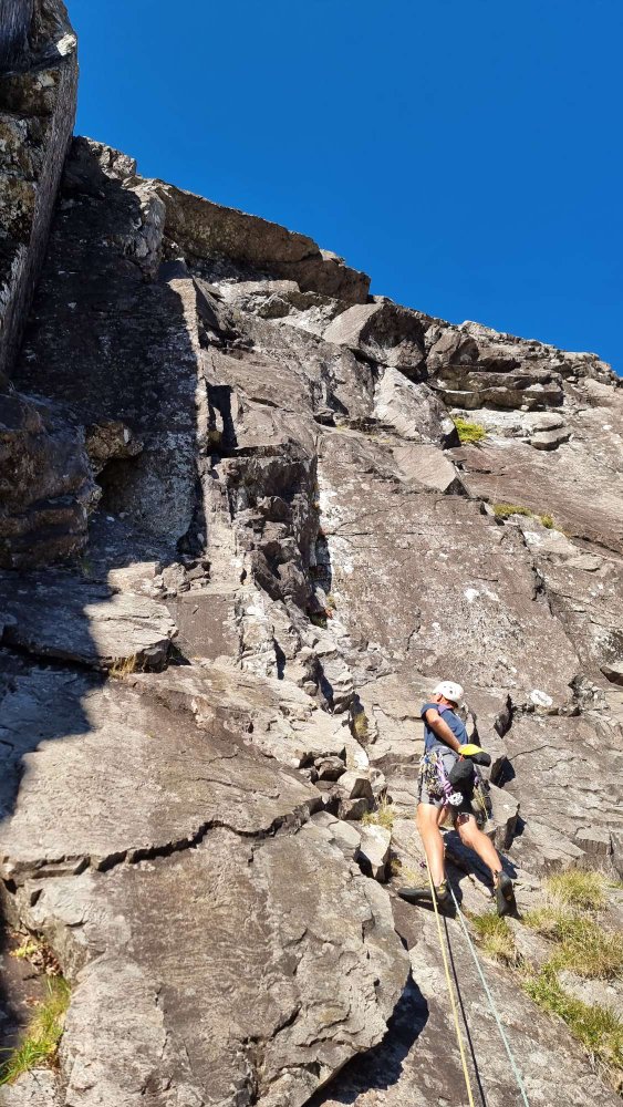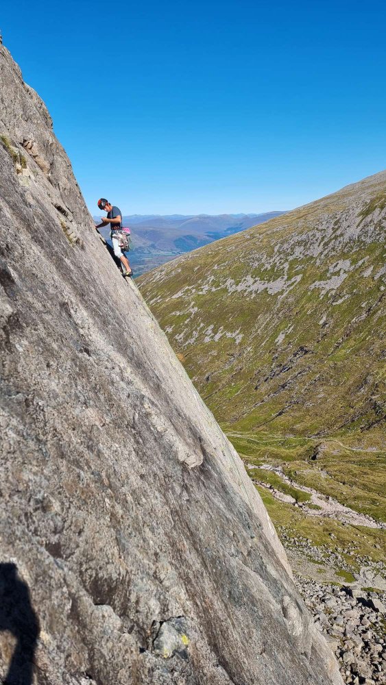 By the time we’d geared up and flaked our ropes, any thoughts of having the crag to ourselves had vanished – it turned out that a number of teams had had the same idea. The Ben was buzzing!