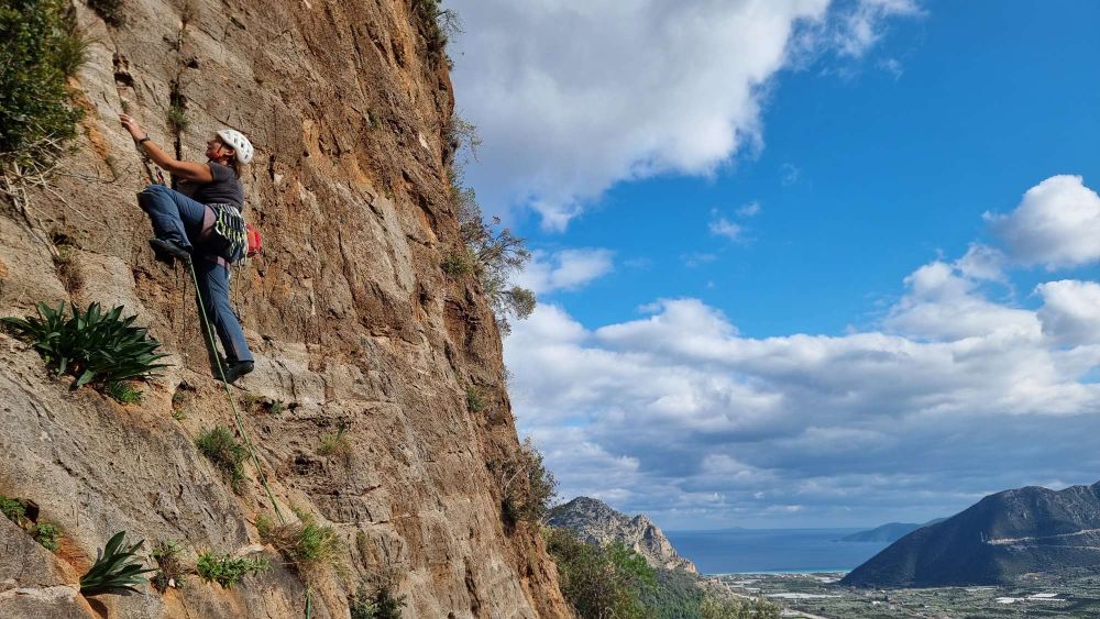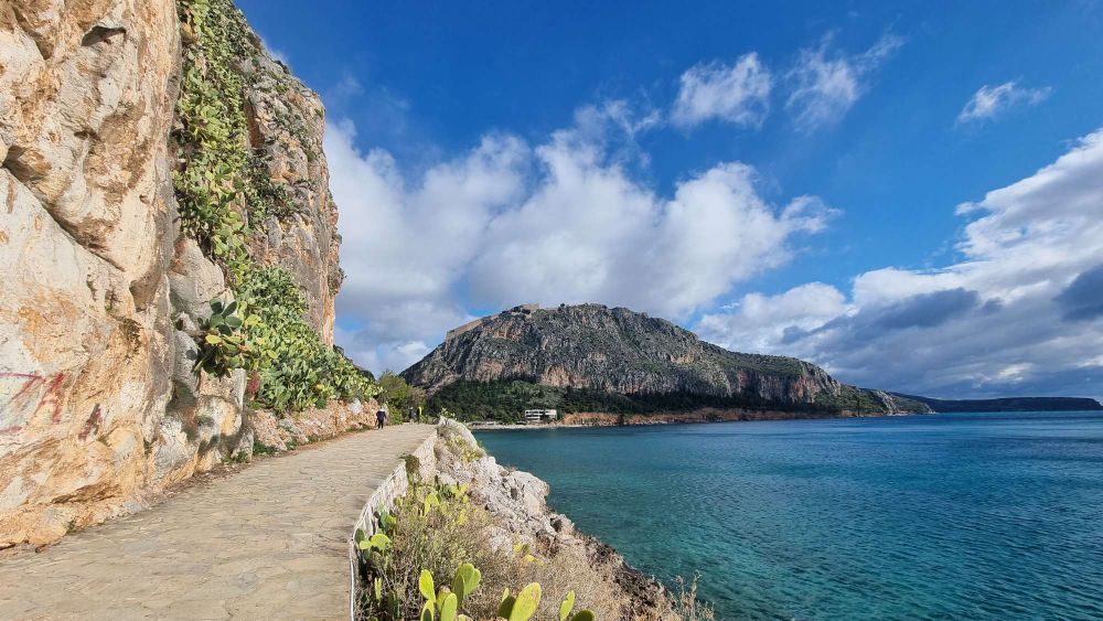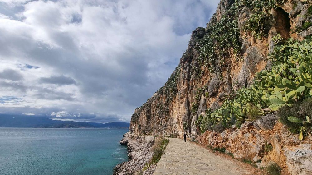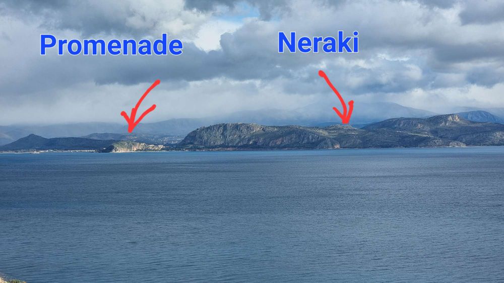 More rain the next day so we deployed the full arsenal of weather apps to convince ourselves that the 90mins drive to Nafplio would yield a sunny afternoon cragging. Heading north along the coast we could see Nafplio clearly across the Argolic Gulf, and sure enough the Neraki and Promenade Sectors were shining like beacons of climbable rock.