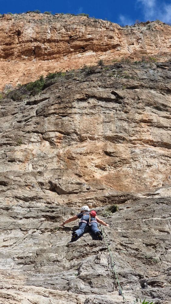 Further left on Orama, Helen did a couple of the routes from the ledge accessed via a short via ferrata: Marneris, 5c, and Tsitos, 6a