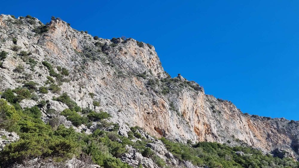 Our route takes a line up the grey slabs on the left of the photo below, for a couple of pitches, before an easy shoulder to level with the left side of the big cave brings four further pitches up steeper orange rock. Seven pitches in all and around 200m up to 6a+.