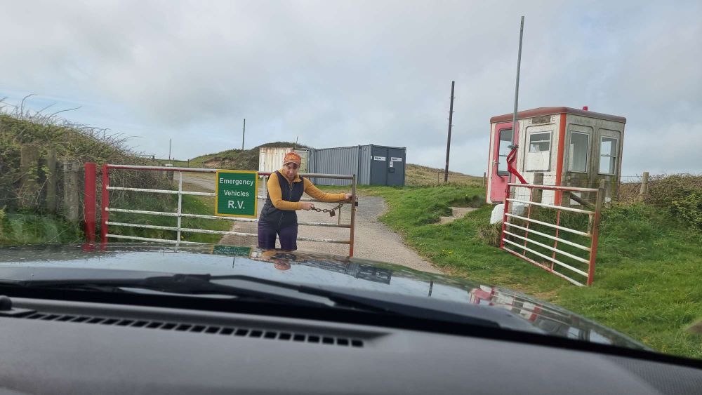 Next morning, 30 knot winds, high seas, overnight rain and the fallout from one of the wettest Easters on record, meant that dry rock would be at a premium. On the plus side, Helen spotted that the red “range closed” flag wasn’t flying, and a quick call to the recorded information line (very handy: 01646 662367) confirmed that Range West was open! We changed plans to head to the Castlemartin guard house to pick up our passes and a key for Gupton Gate. The illicit thrill of being allowed privileged access “behind the wire” almost makes the actual climbing a bit of a bonus extra!