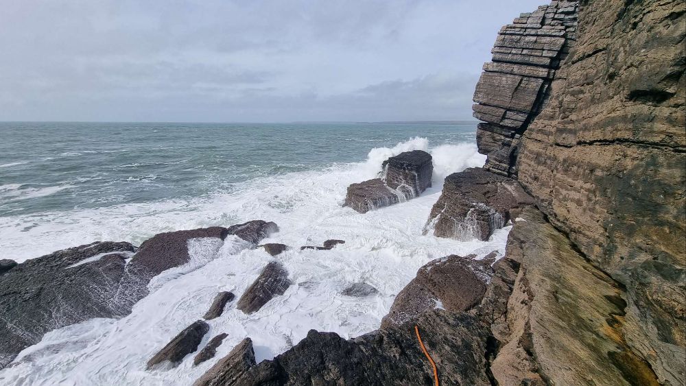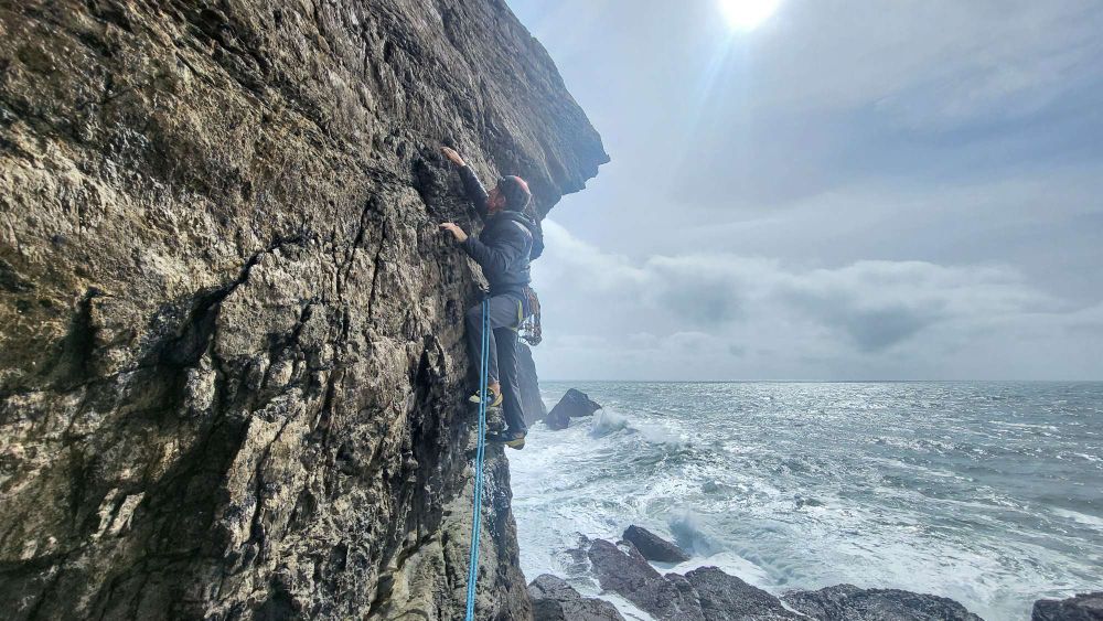 The following day yielded non-stop rain until mid-afternoon, when the weather transitioned from grim to glorious in a matter of less than an hour. The big swell meant that anything near the briney would be a bit too sploshy, but at least the accompanying wind made for good drying conditions. Making the most of the glorious evening required another half-height crag and 40ft Wall was just the job. Another 50m along the cliff, waves were breaking over the top of Juggy Point (despite it being low tide)
