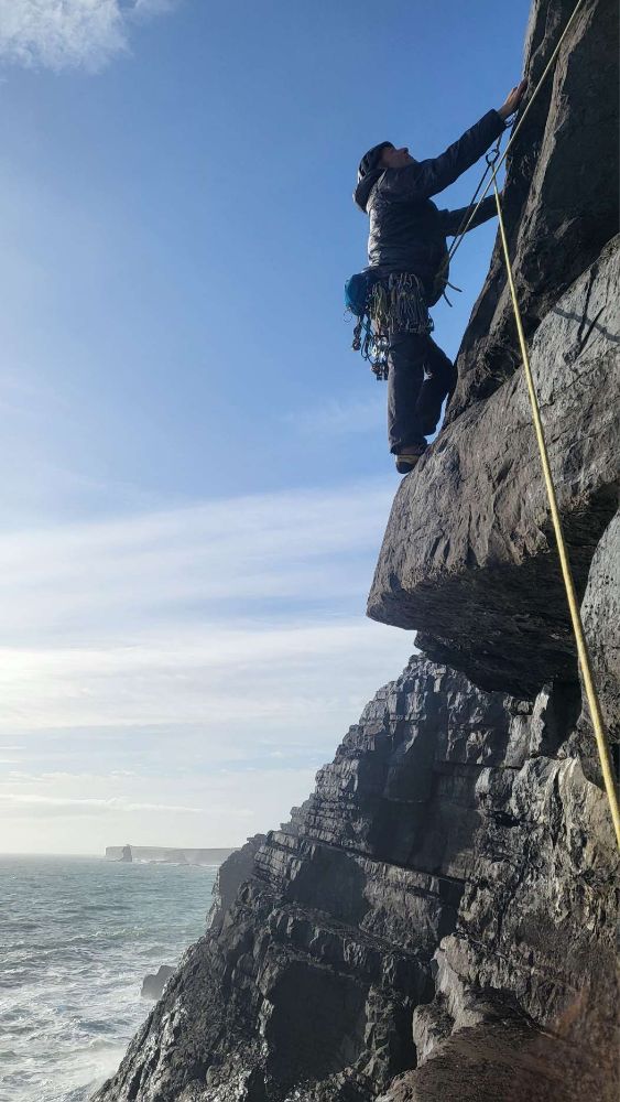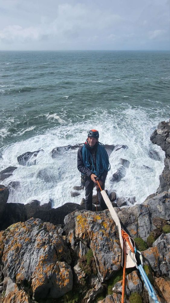 … and we arrived only to realise most of the routes were completely out of the question as the waves were breaking at least halfway up the crag. Happily, we spotted Still Slab, which not only has a half-height ledge from which the routes start, but is also somewhat protected from the raging Atlantic by a rock plinth a little way out to sea. We might just have stumbled on the only climbable bit of rock way out in the wild west.