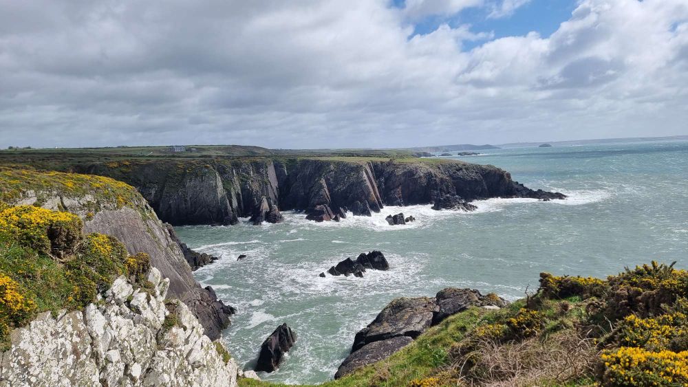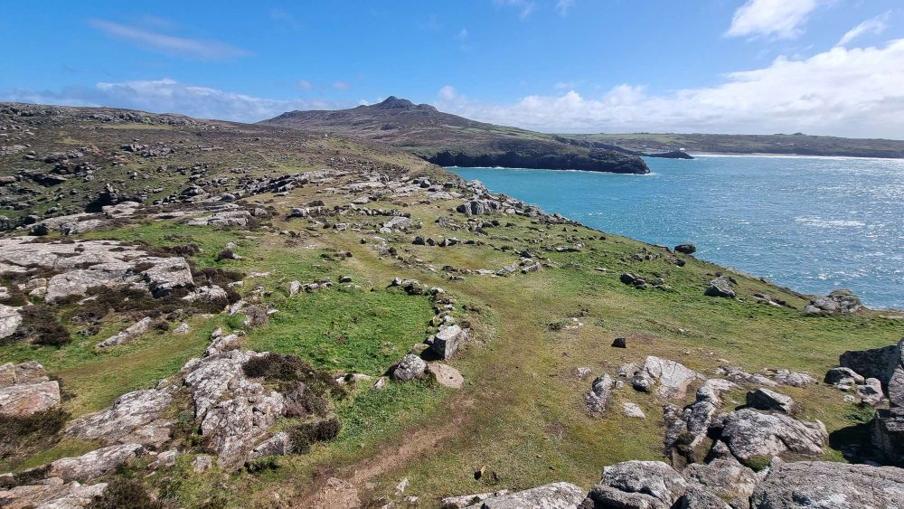 Dry the next day, but the wind and inconvenient tide persisted. South Buttress on St David’s Head was an ideal spot, with the bonus of a bit of archeology thrown in – the 5,000 year old Arthur’s Quoit burial chamber and these Iron Age hut circles.