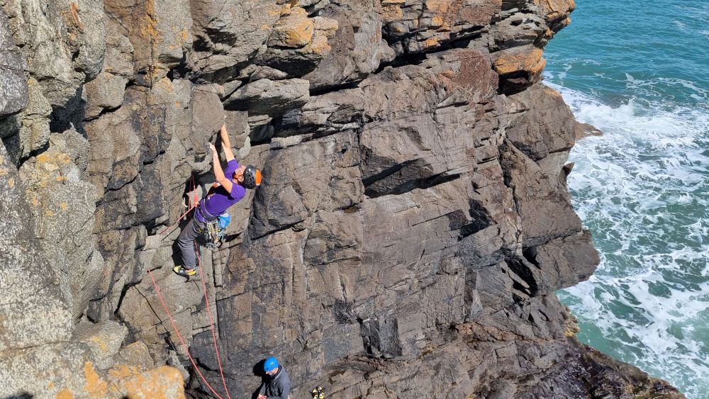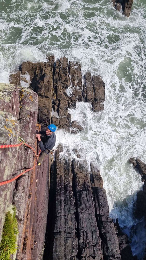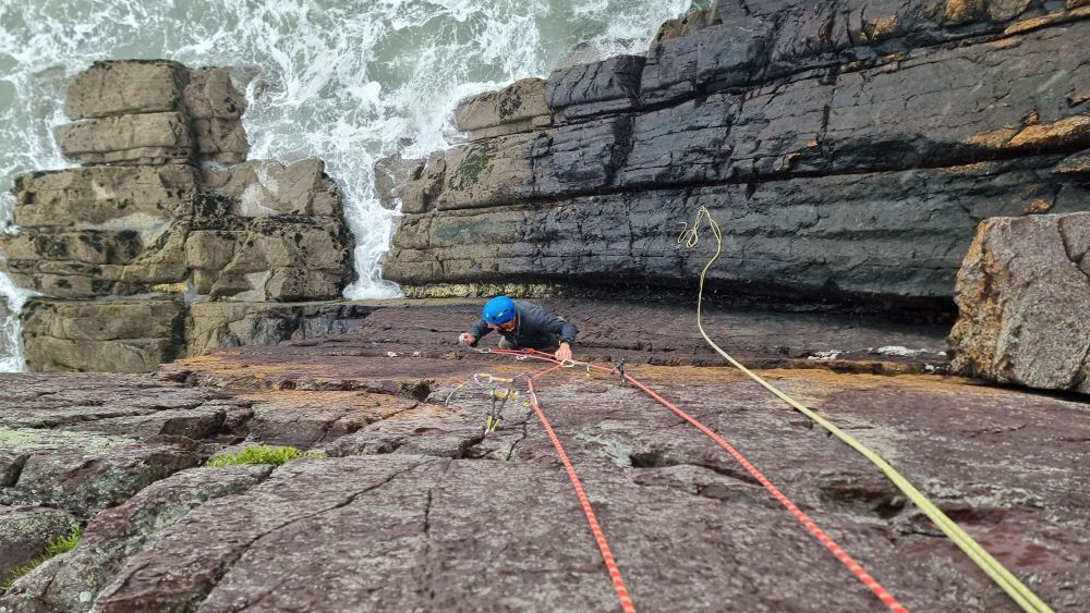 Having weathered one downpour on the short walk (sun to soaked to sun again in 5mins), Jim and I arrived at Velvet Wall to find we’d absolutely nailed it. The rain had already evaporated and the situation in a tight zawn was providing shelter from the crashing waves, with a high belay just about keeping toes and ropes out of the briney.