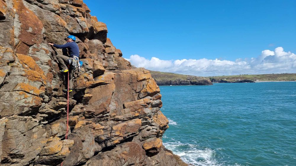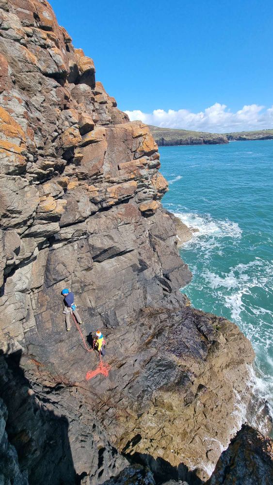 With our brave boys having resumed firing on The Range (great to know we’ll be well prepared if the Russians decide on a beach landing in south Wales!) we shifted base to St Davids where we met up with Jim and Claire. April’s “four seasons in one day” weather looked set to continue, with 30kt winds, squally showers and temps barely above 10C offset by interludes of bright sunshine. A midday high tide threw a further spanner into the works of the crag-selection algorithm, and it came up with Velvet Wall in St Non’s Bay as potentially the only feasible option for a quick route or two.