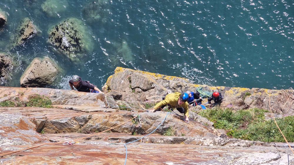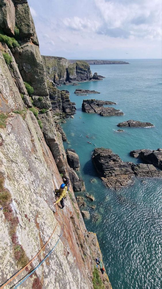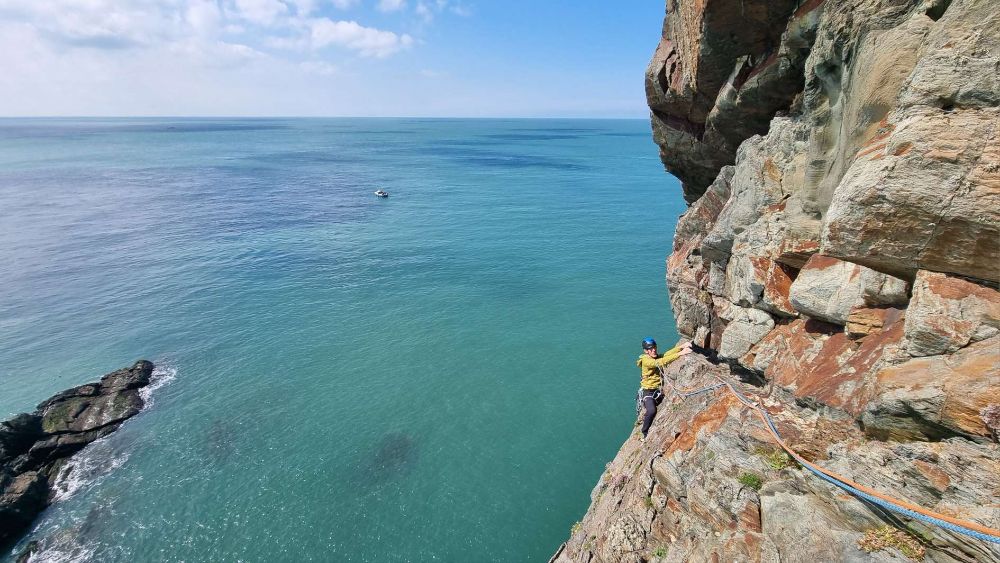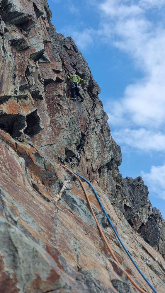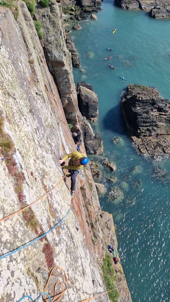 In reality, there wasn’t so much “new (to us)” climbing, as you start up Pel / Freebird to the half-height ledge and then head across the airy break of North West Passage, to join Where Puffins Daren’t to press on around the corner into less familiar territory.