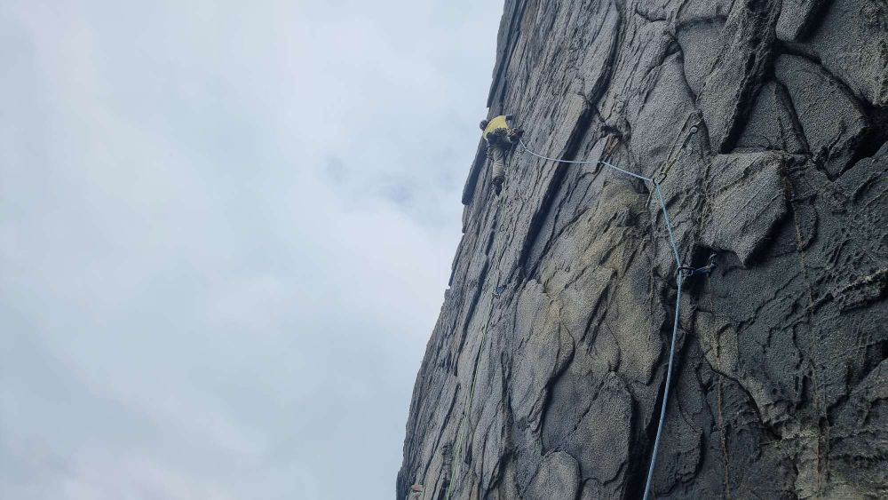 Undeterred, Jake fired up Lipp Service, E1 5b (no giveaway, especially in the wet, and certainly not HVS as per the definitive guide). We were joined by a group of four lads on a foray from Aberdeen, who served to confirm we’d made a sound judgement with the weather. They were quite surprised to find someone else there (and even more surprised that it wasn’t my first visit), and very welcoming to folks from the south. Here’s one of the team on Lipp Service: