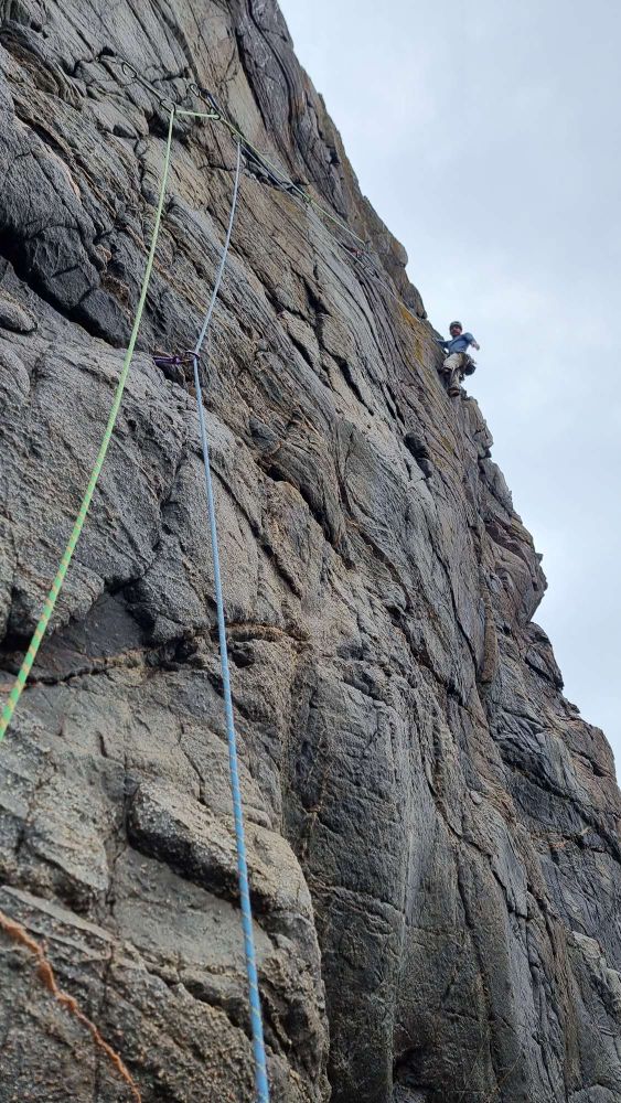 Jake was in full “dampness denial” mode and made an impressive ascent of the excellent adjacent Shapeshifter, E4 6a. Very bouldery start and an airy finish!
