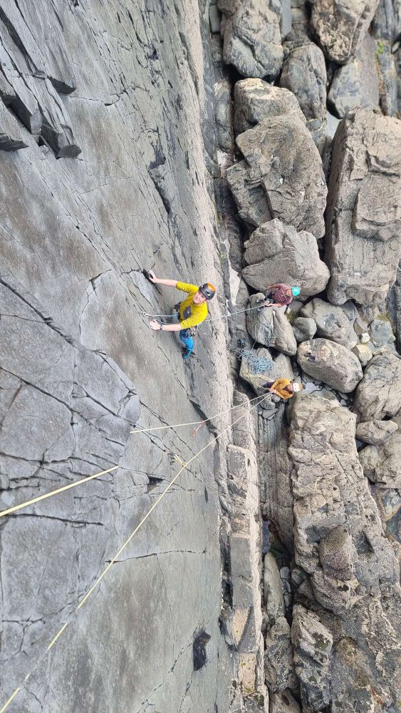 A decent selection of about a dozen routes in a benign and beautiful seaside setting. We did Ruddigor, and Red Crack, both HS and Jellyfish, VS though the top-outs deserve respect (I’d add an extra notch (or even two!) to the grades just for the last 10ft.