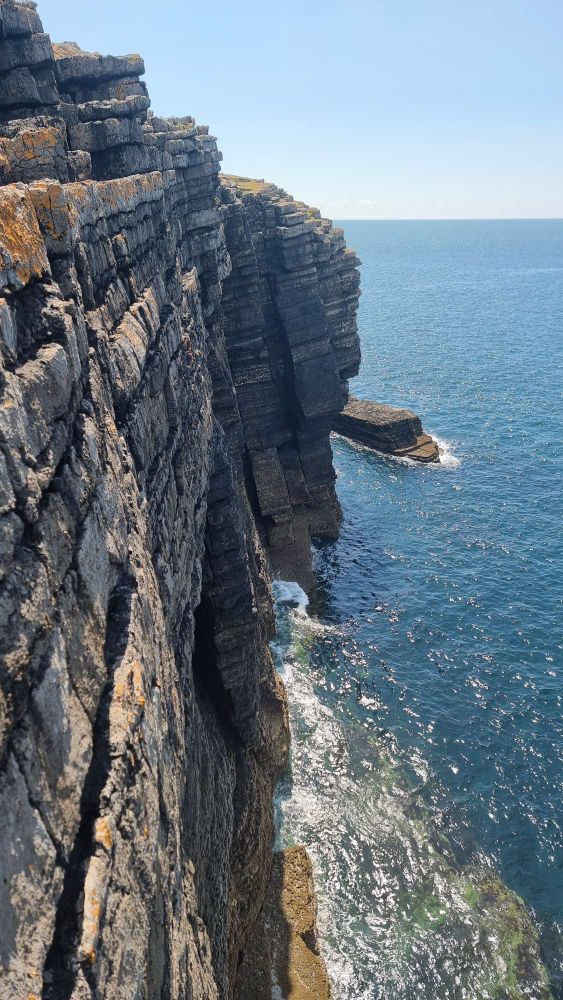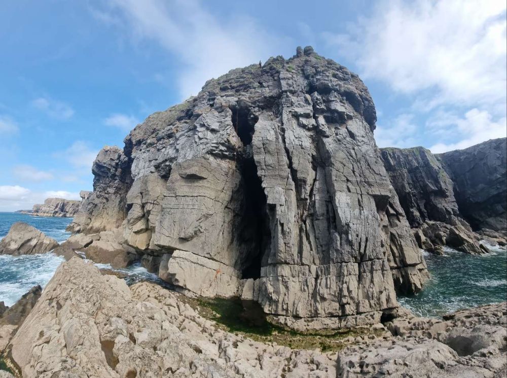 A docile sea made for easy access despite the high tide and I generously let Jake lead the cruxy first 5c pitch. Amazing how I retained a dim memory of the moves from my previous ascent 30 years before. They haven’t got any easier!