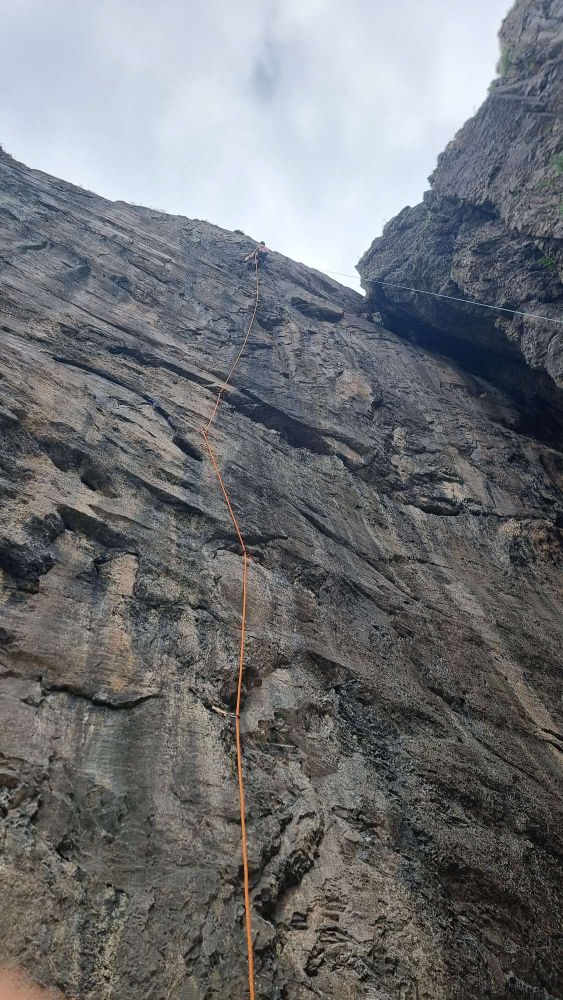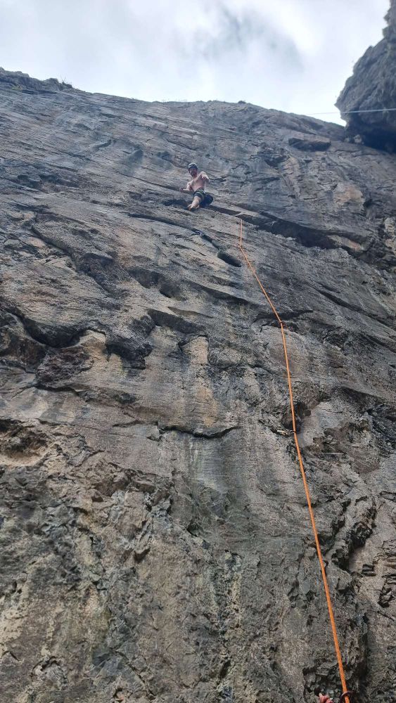 A quick peek on abseil suggested that the climbing (generally felt to be 7a+/7b sport equivalent) shouldn’t present too much of a problem, but the runout from around 1/3 height to almost 2/3 height gives meaning to the name. Even with a very attentive belayer you wouldn’t want to fall off!