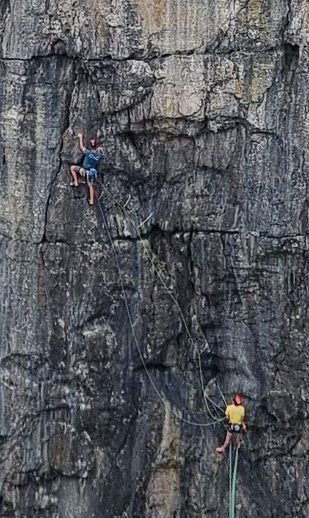 Wanted to do this since I was about 15, always thought I’d onsight it when I was older and better. Now I’m a fair bit older, only a little bit better, and much less bold than I was then! Hadn’t even planned to do it today but it caught my eye on the ab down to do Mysteries. Couldn’t justify the risk of the onsight to myself, did one run on toprope to clean and make sure there were no nasty surprises, then lead first go placing gear. Still plenty gripping for me! With Dad