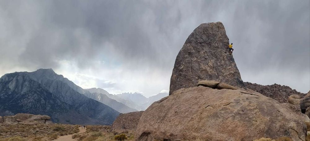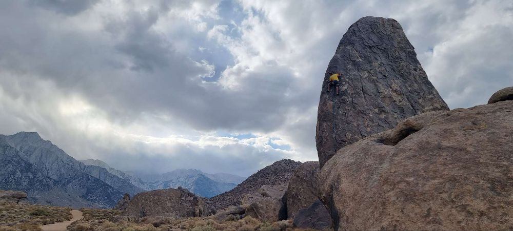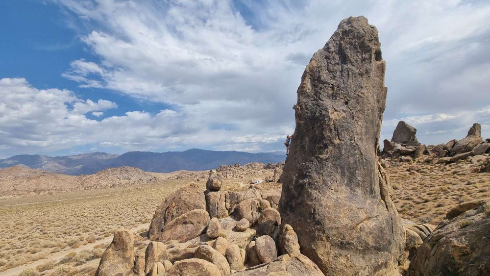 The Alabama Hills are reminiscent of the much more famous Joshua Tree, strewn with granite lumps – boulders, domes, fins and pinnacles, with well over 500 easily accessible routes established – many of them belay-from-the-bumper friendly. It’s been termed “the ultimate lazy man’s crag” – just what the doctor ordered!