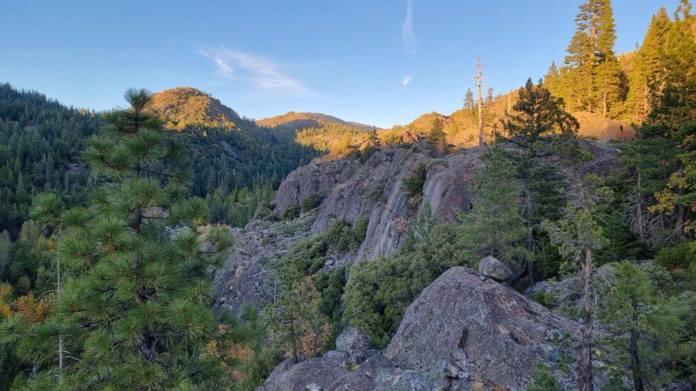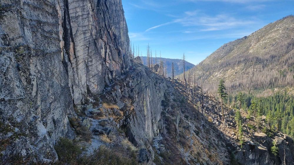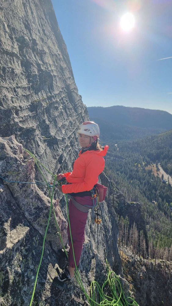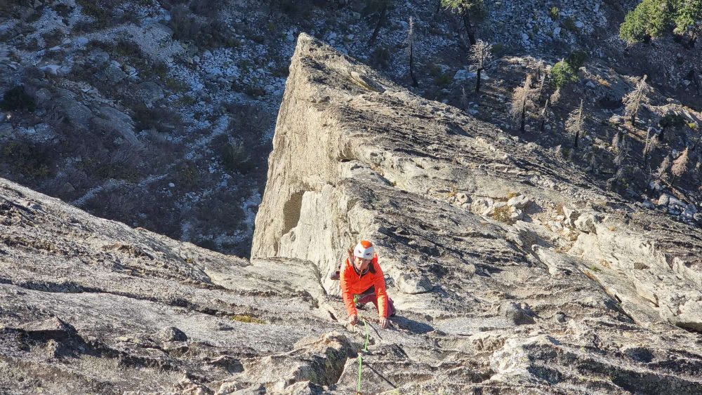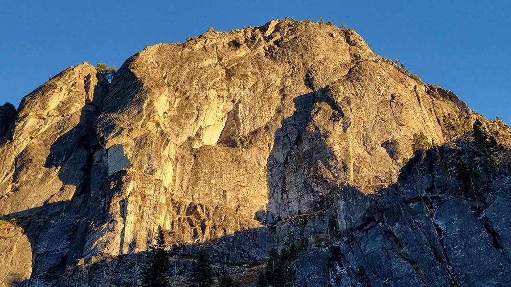 The most famous area in the vicinity is Lover’s Leap, a 600ft mostly vertical sheet of granite, whose foreboding countenance is made much more friendly by endless strata of horizontal dikes. These unique features make for some spectacular but amenable climbing. The only drawback, for our visit at least, is that the crag is largely north facing, and at 7,000ft in late October that makes it a tad chilly. Nonetheless, we were drawn to visit, not least by the online cheerleading for Corrugation Corner, a 300ft, 4-pitch 5.7. Plenty of shouts of “Best route I’ve ever done” on Mountain Project, backed up by superlatives on UKC: “one of, if not THE BEST 5.7s anywhere” and to top it all: “The best VS in The World!”