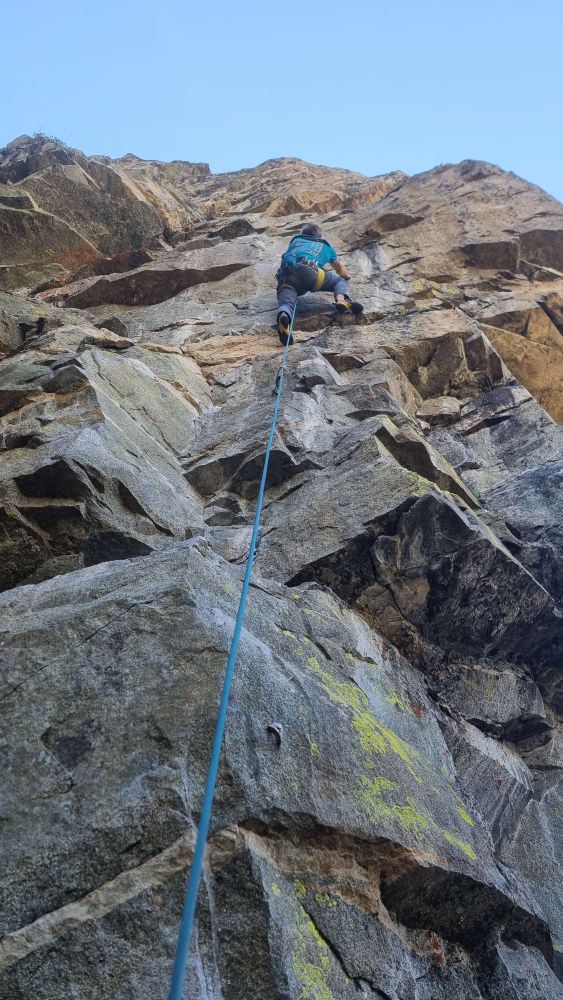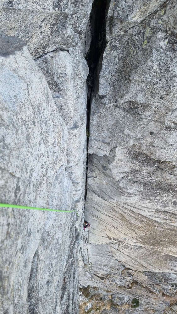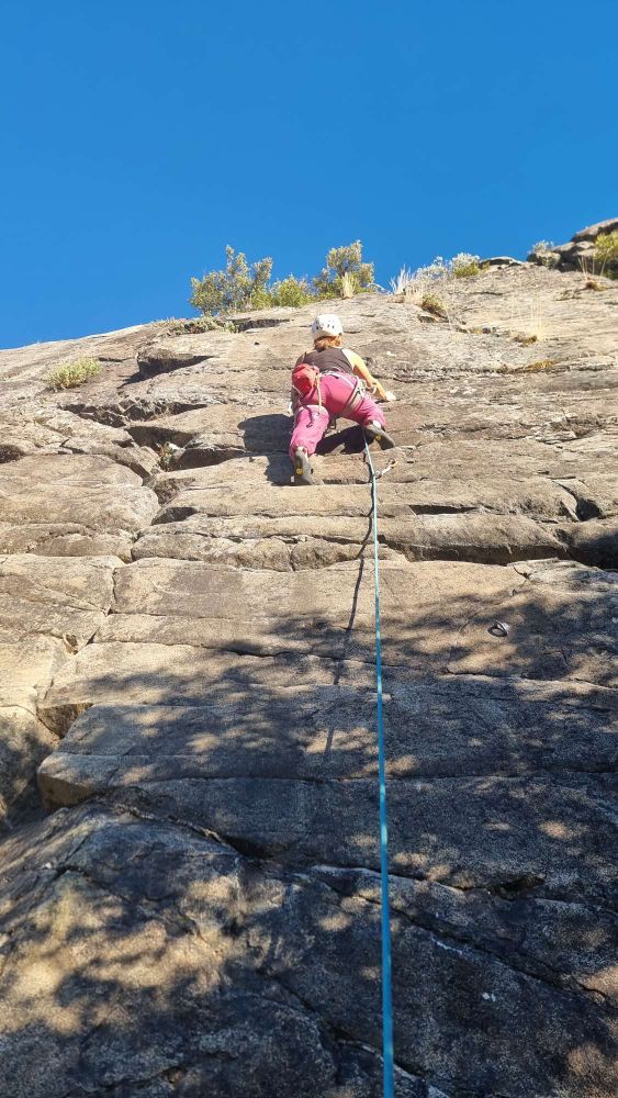 Pitch 3 features a short chimney, a mildly harrowing traverse and then a long juggy corner. Careful back-cleaning and an intermediate stance will protect the second better on the traverse.