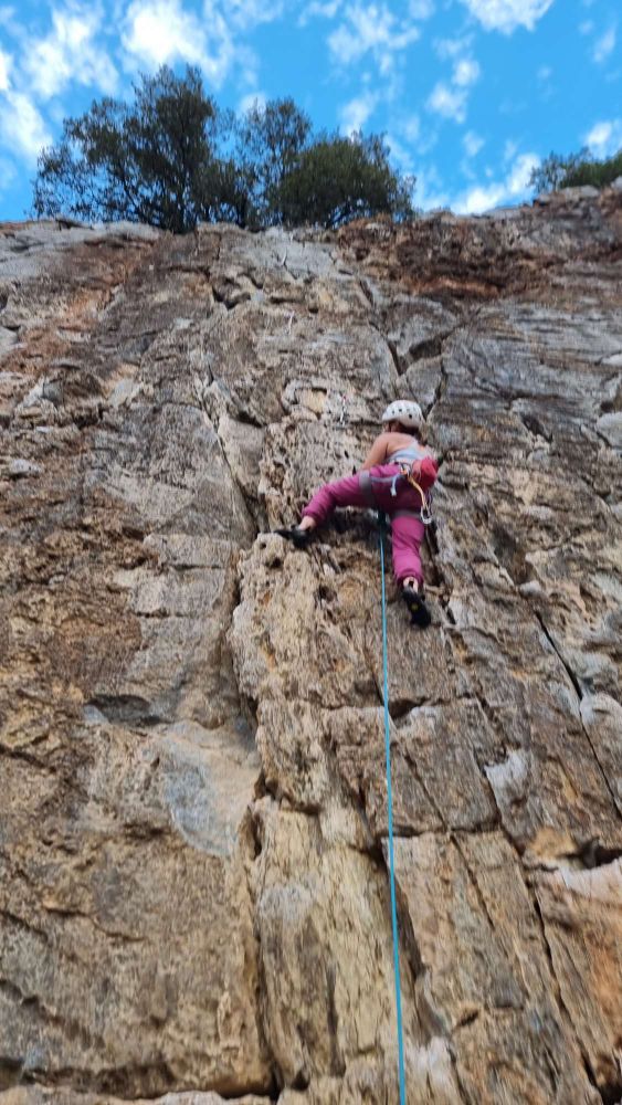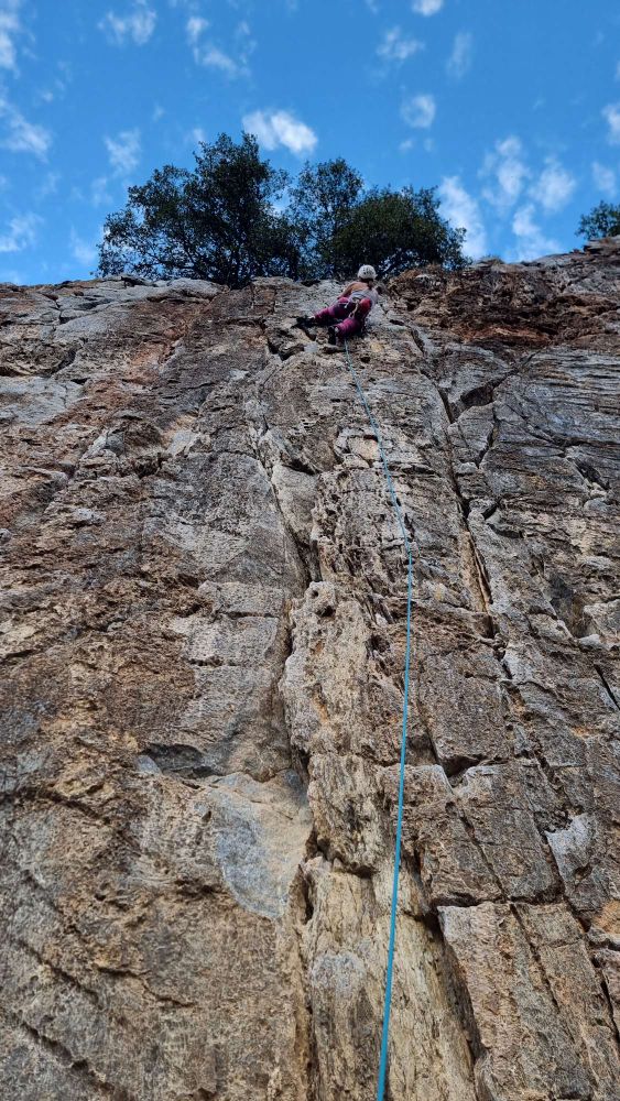 … and then switched our attention to the slightly quieter sport routes on the Ort Wall opposite. Here’s Helen on Side Saddle, 5.9