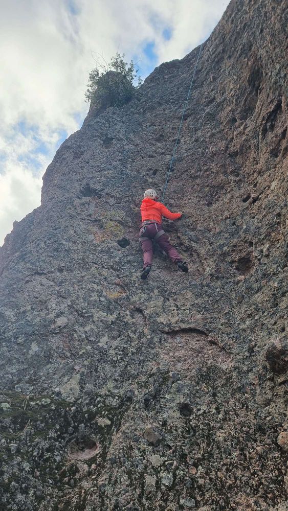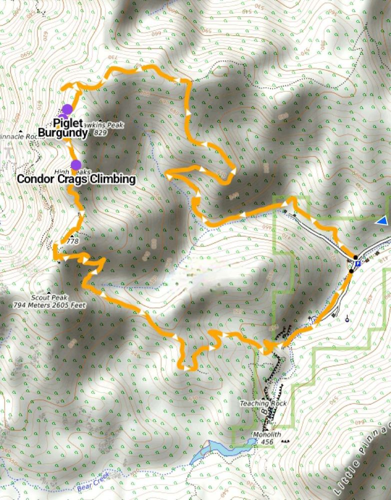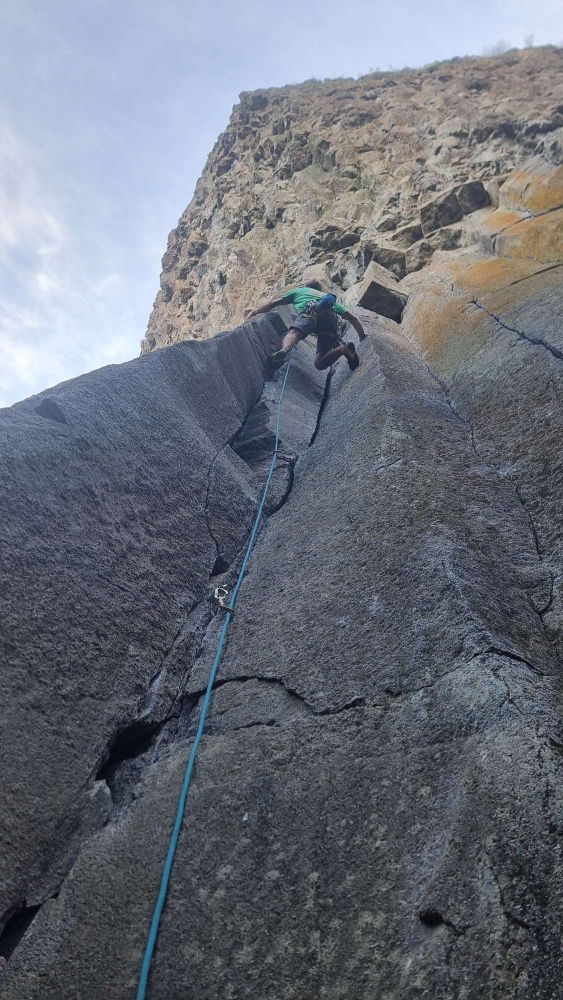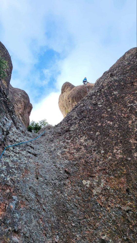 … to Condor Crag. This is the highest point in the Park and site of the first recorded route in 1933. We chose to do St Valentine’s Day Massacre, which starts up the regular route but leaves where that turns into a grungy chimney to take a wild but easy traverse then blunt arete to the summit. Just about manageable in a single 40m pitch with careful ropework.