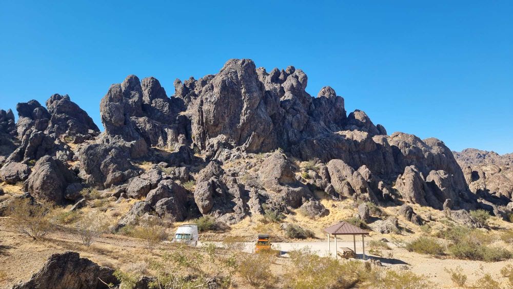 The camping is of the “too good to be true” variety – we’ve camped at plenty of free, officially sanctioned “dispersed camping” areas across the States, often in gorgeous locations, usually with a fire ring, and occasionally with a table – but each of the 18 sites on the Sawtooth Canyon Campground also comes with a splendid sunshelter!
