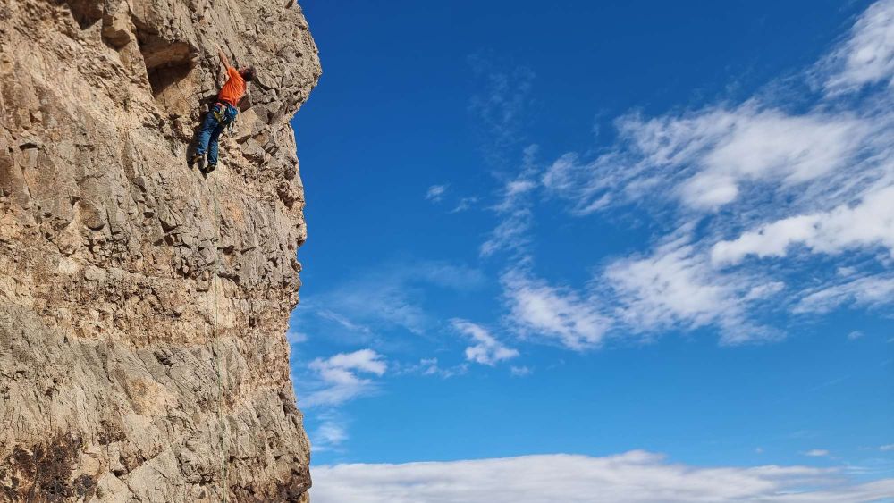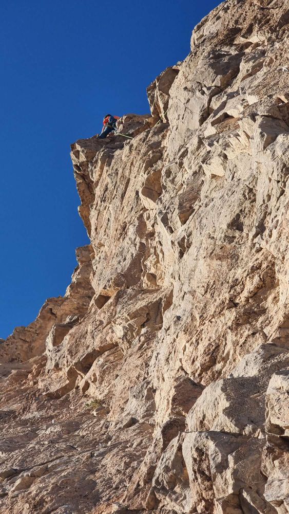 We had a couple of decent days there. I particularly enjoyed Scorpion, 5.9+R and Pandemic, 11a – a couple of recently developed, traddy-feeling routes running the full height of the crag (almost 40m so needing some shenanigans to descend on a 60m rope!) Here’s the view down Scorpion: