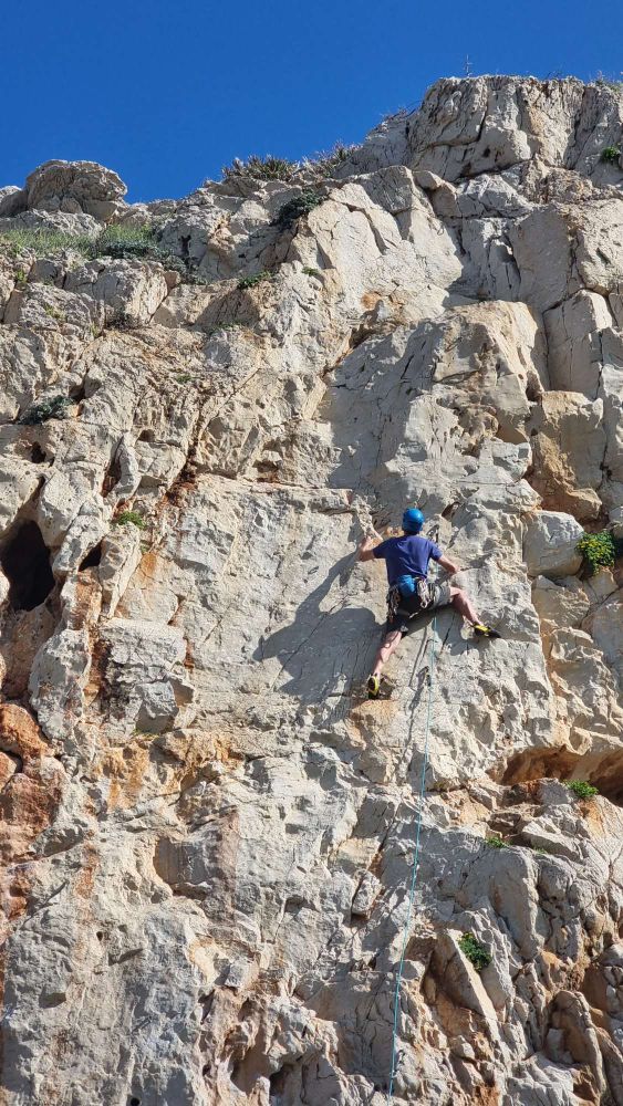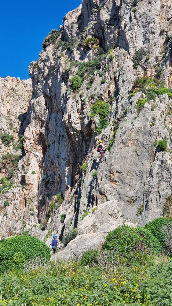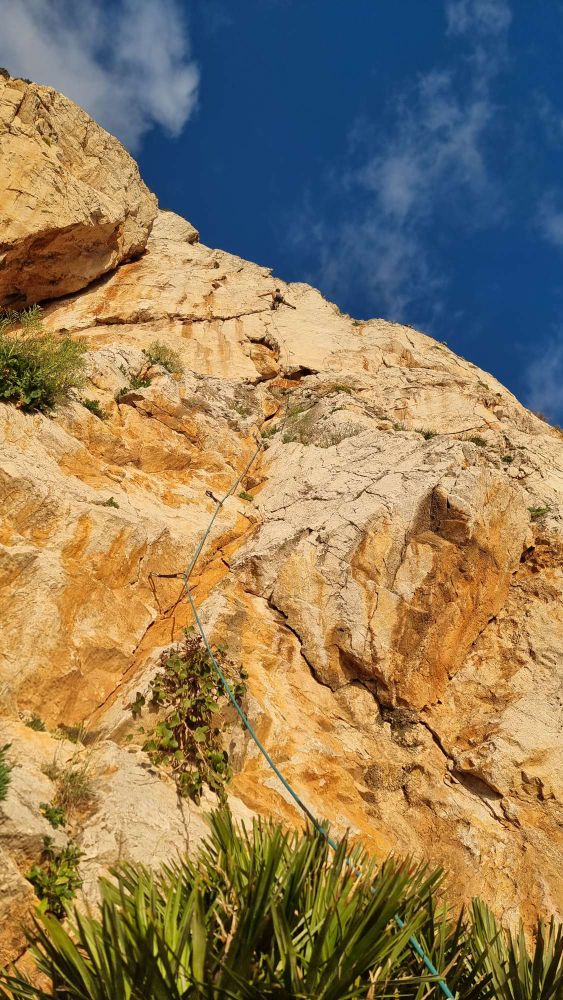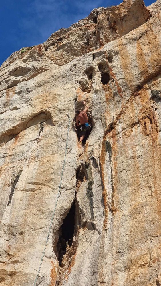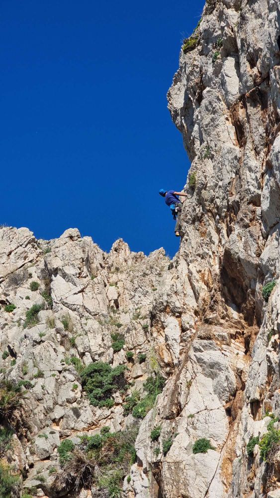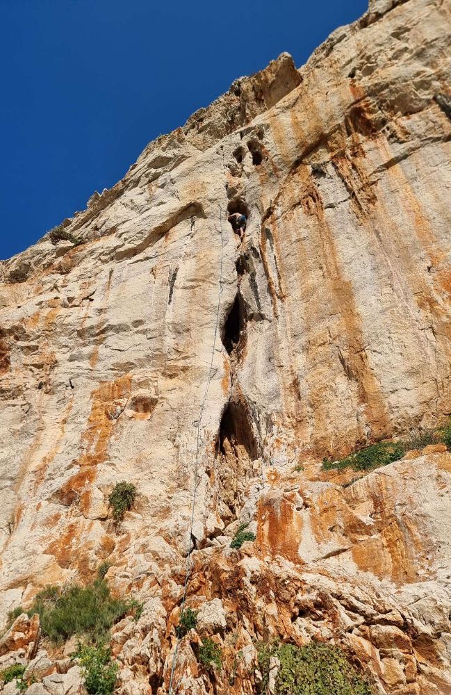 There’s an absolute tonne of rock in the vicinity, with cliffs up to 400m towering above town, and scattered towers and outcrops, but it’s Scogliera di Salinella that’s the main attraction. Imagine a crag the length of Stanage (that’s over 4km for those who don’t know Stanage!), but composed of white, grey and orange limestone, up to 60m high in places. Now perch it set back from the sea by a hundred metres or so (close enough for the sound and scent of a seacliff but without the tiresome tides and abseiling). Finally, sprinkle liberally with blue skies and sunshine, park a climber-friendly campsite at one end. Carlsberg don’t do crags, but…