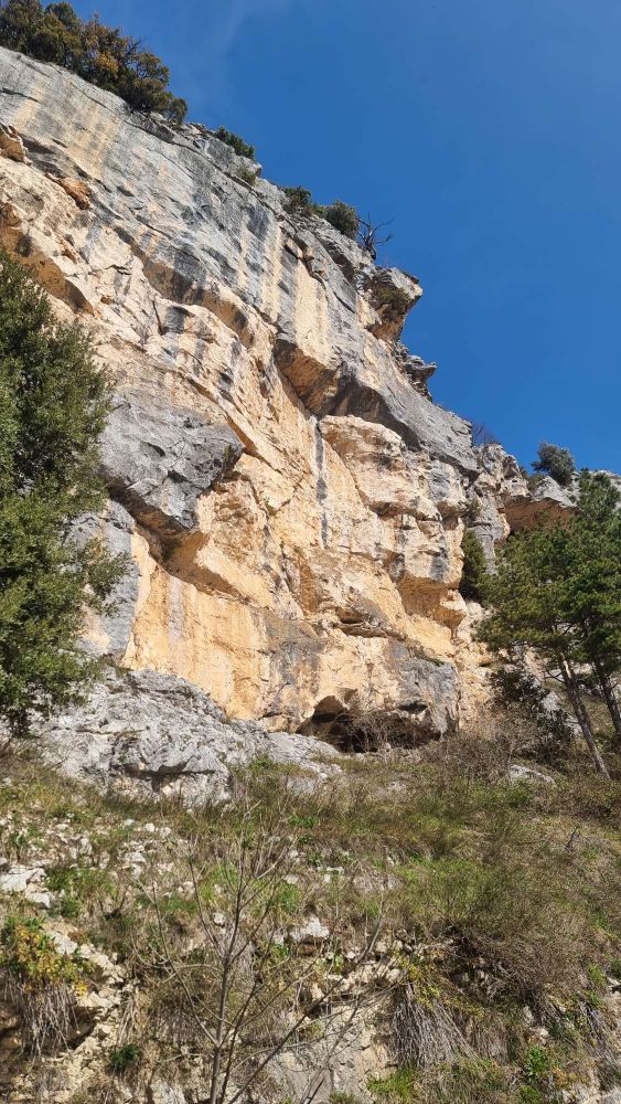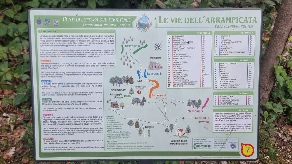 The Il Torrione sector is the first you come to, just after exiting the tunnel that gives access to the gorge, approached up an obvious ramp on the right of the path.