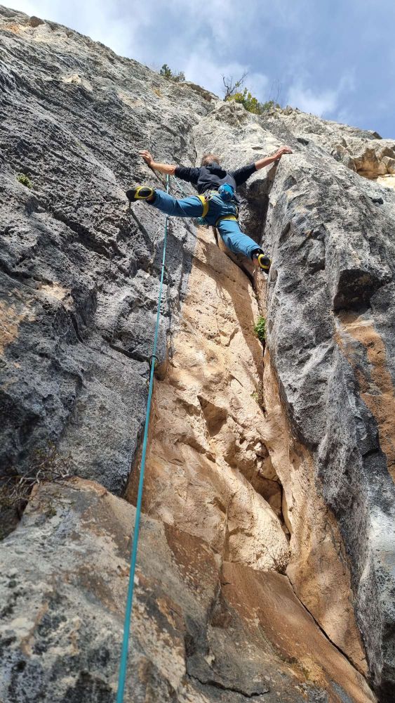 We trundled up to the far end of the crag and found Peter Pan, 6a+, unoccupied. It’s compact grey/white rock with enough hidden pockets and slots to make progress through the unlikely looking territory (imagine a superior version of the better bits of Chee Dale). Very good but quite tough (to repeat an oft-used phrase from this Italian odyssey).