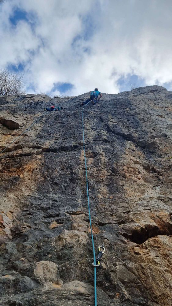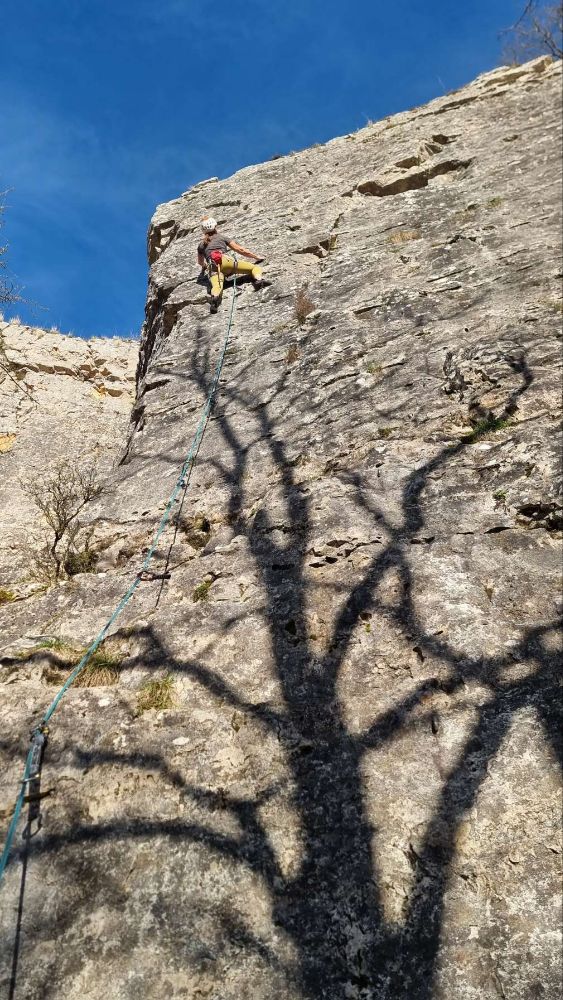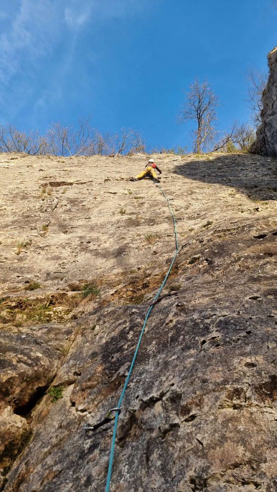 One minor grumble is that it doesn’t come into the sun until 11am, and even then it’s only a couple of routes on Sector Soleil that get any warmth before noon, which is why we kicked off with a “then and now” repeat ascent of Pise Aller, 5a, and Pise Retour, 5c