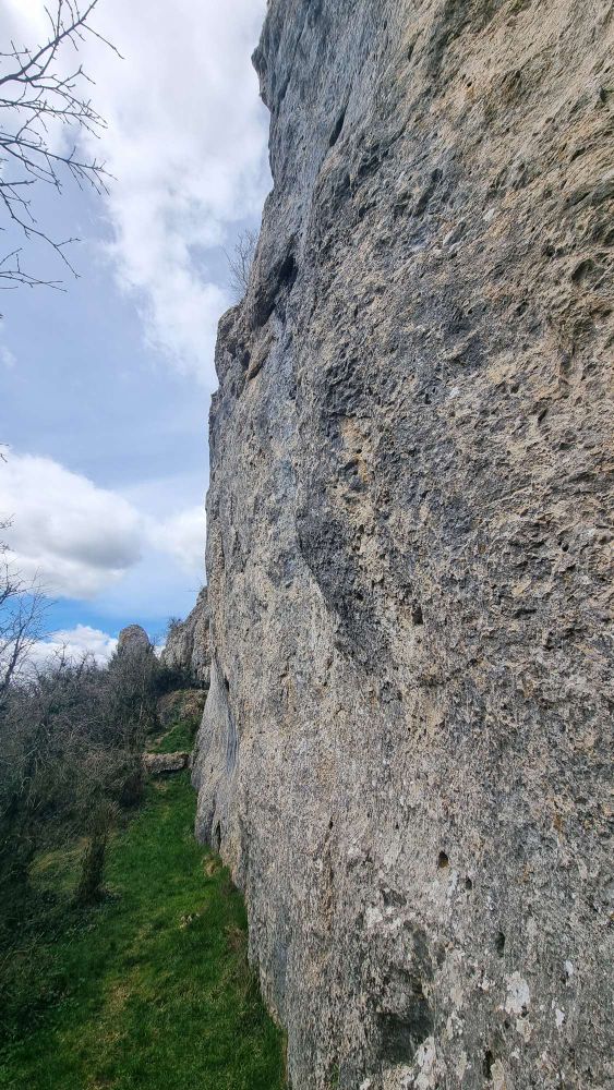 Mont Rome is an unusual crag, made up of a jumble of limestone monoliths sticking randomly out of the ground, with climbing on both sides of some and facing all orientations. You park at the top (if Google tries to take you on a dirt road, re-navigate and approach from the other side) and walk down for a couple of minutes to access the first sector: Le Pot de Chambre.