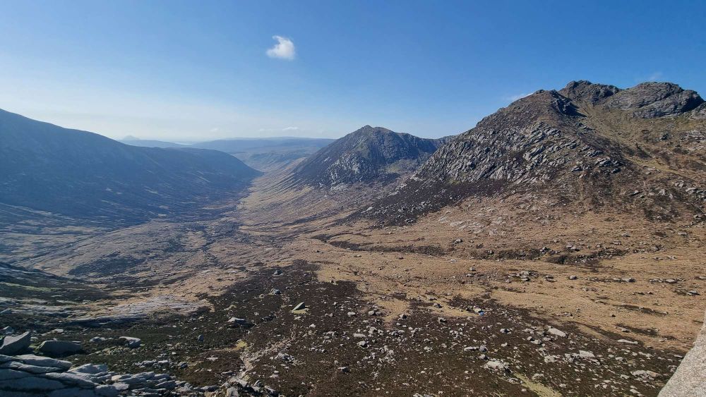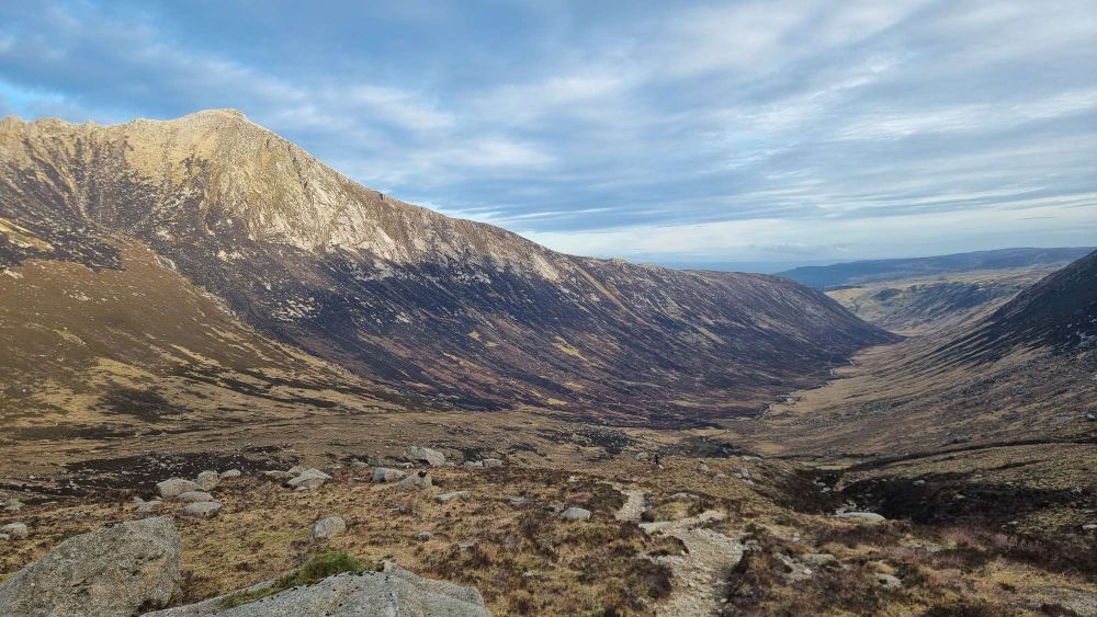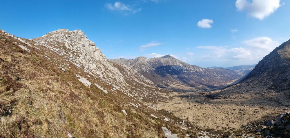 There are various online mentions of a dull and boggy walk up the Glen, but that’s a massive disservice to a spectacular piece of geology, with the towering granite pyramids of the Rosa Pinnacle and Chir Mor constantly drawing the eye. Completely dry under foot too.