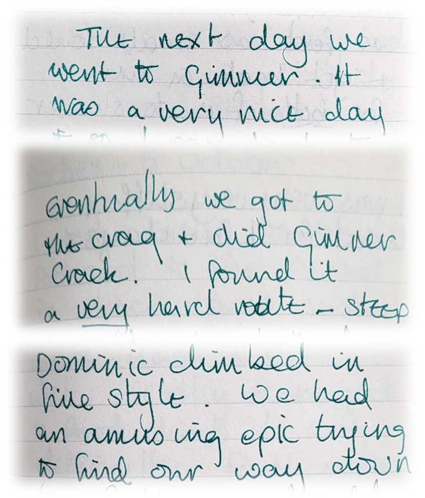 I started my Hard Rock journey in 1987, almost 40 years ago, with Helen on an ascent of Gimmer Crack. Here’s the entry from her climbing journal of 29 September…