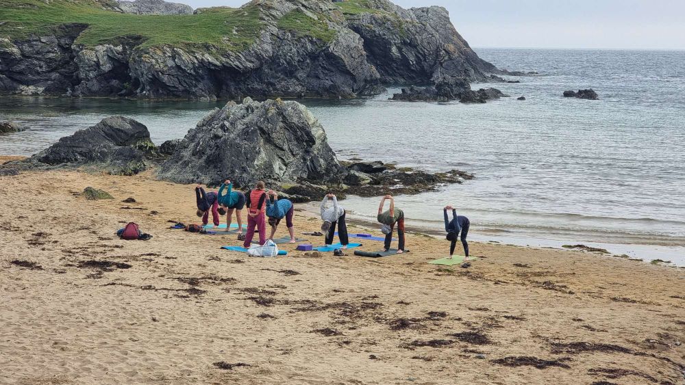 Assembled at Porth Dafarch beach for some post-climb yoga.
