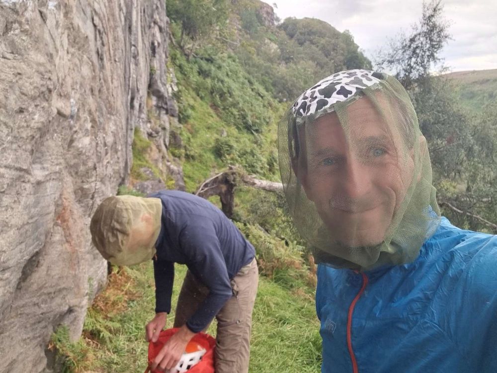 Back onto the Great Wall and we’re in T-shirts for Strapadicktaemi, E1 5a, which Paul romped up in one huge 50m pitch. Rapping off we were very content to call it a day, but the rope had other ideas – twizzling itself into an intractable clusterf#@k – No option for it but to use what was left to do Inbred, HVS 5a, in a couple of pitches to retrieve the situation. We’d strayed past midge-o’clock and it was time for a hasty retreat!