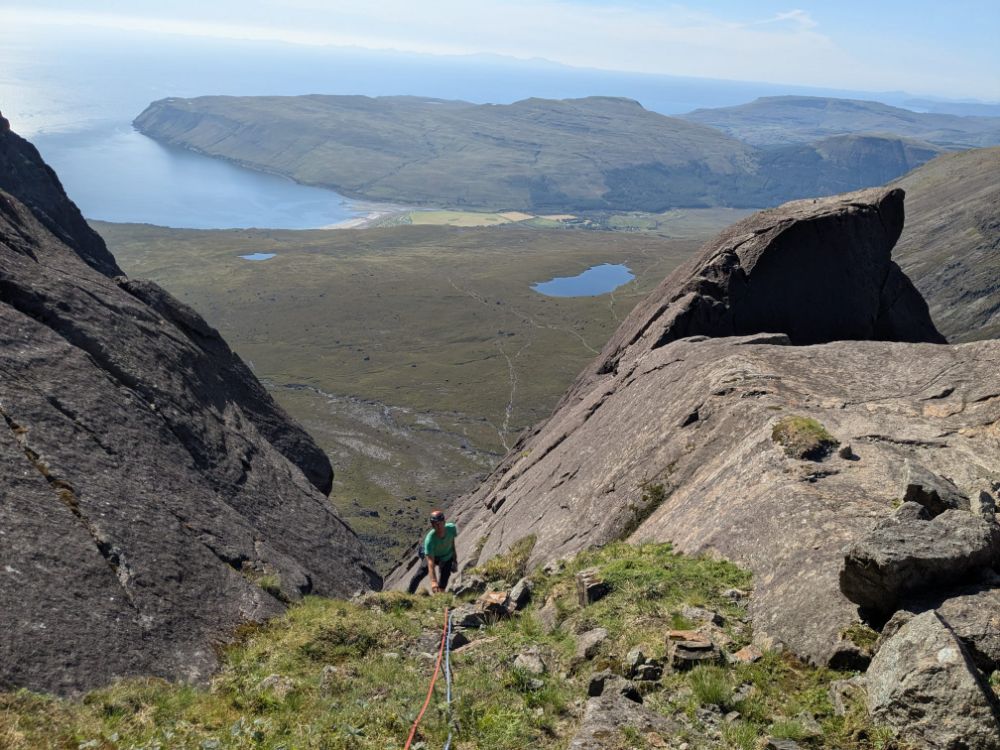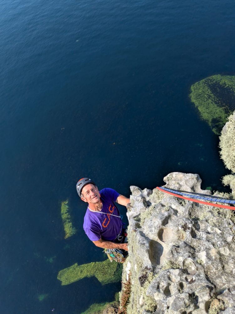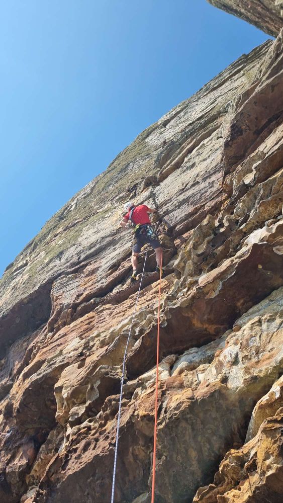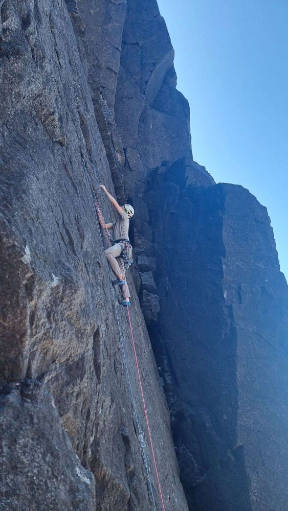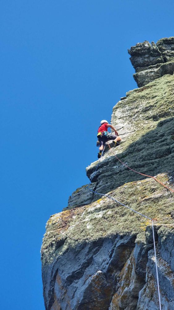 We arrived to find a couple of teams in situ – one on Vulcan Wall and the other on Uhuru. The Uhuru leader turned out to be John who I’d last seen on Pabbay – small world! Who should happen along later but Flavio and Jen. VERY small world!