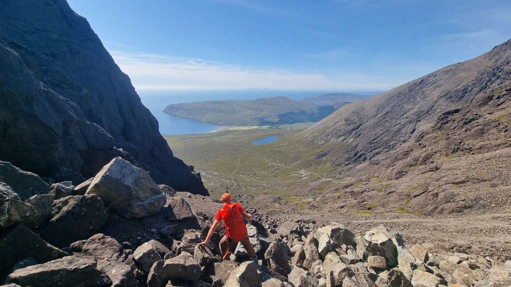 Top tip – don’t descend the first gully you get to (Eastern Gully) but instead go all the way to the top of the Sgumain Stone Shoot and descend as for Vulcan Wall. The SMC Wired guide explains this in the text BUT includes a topo that seems to suggest heading down East Gully with an ab to finish. We certainly didn’t find an ab point.